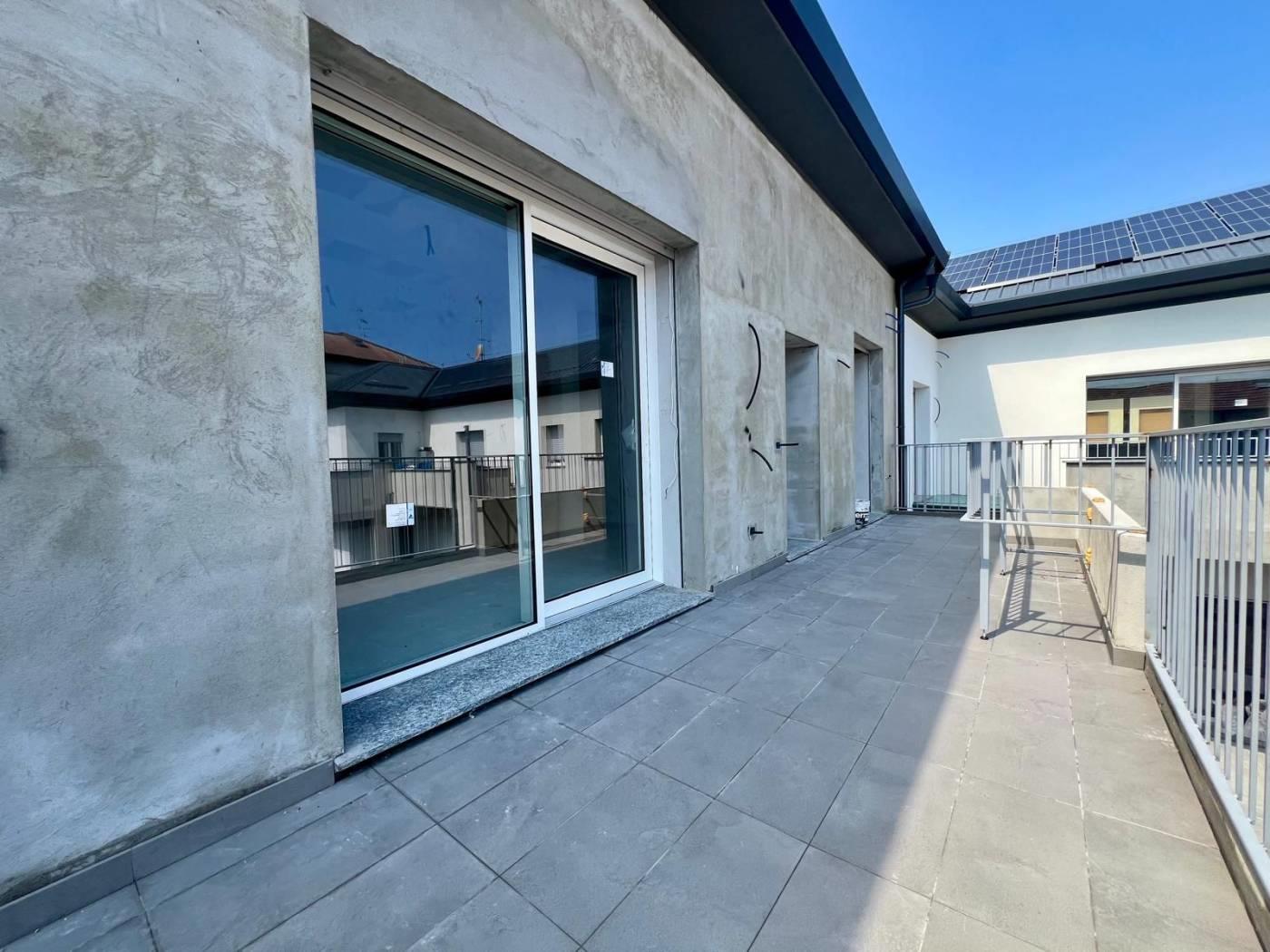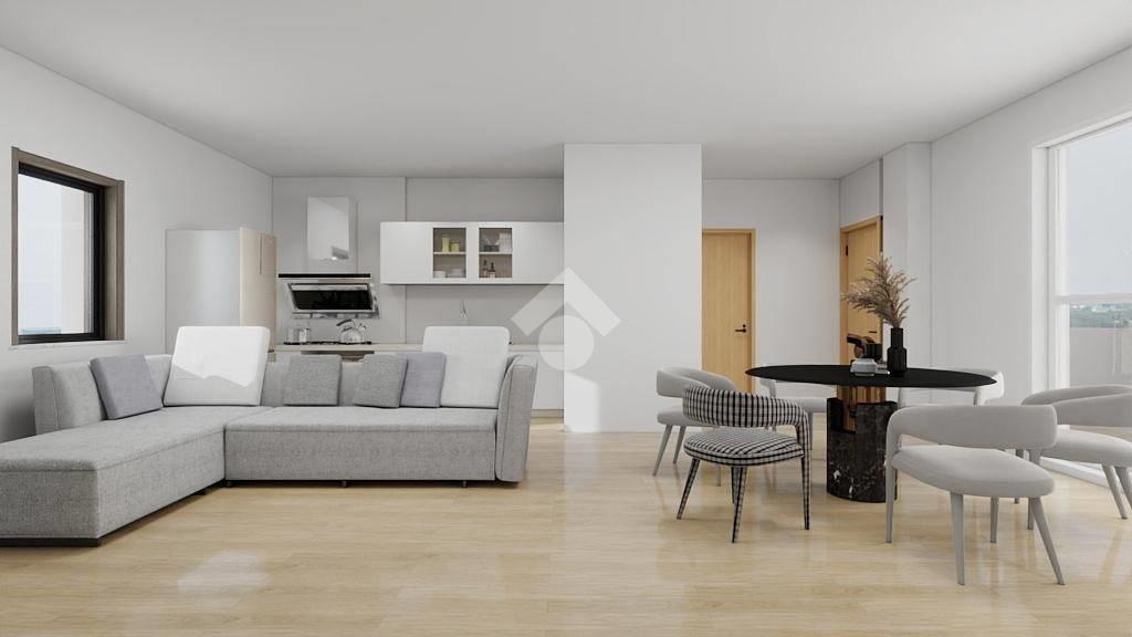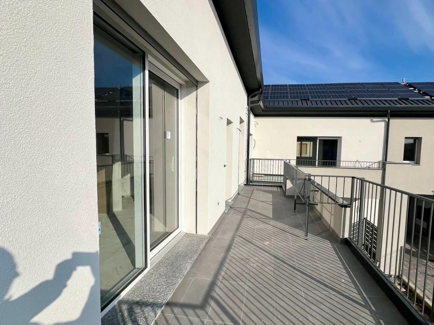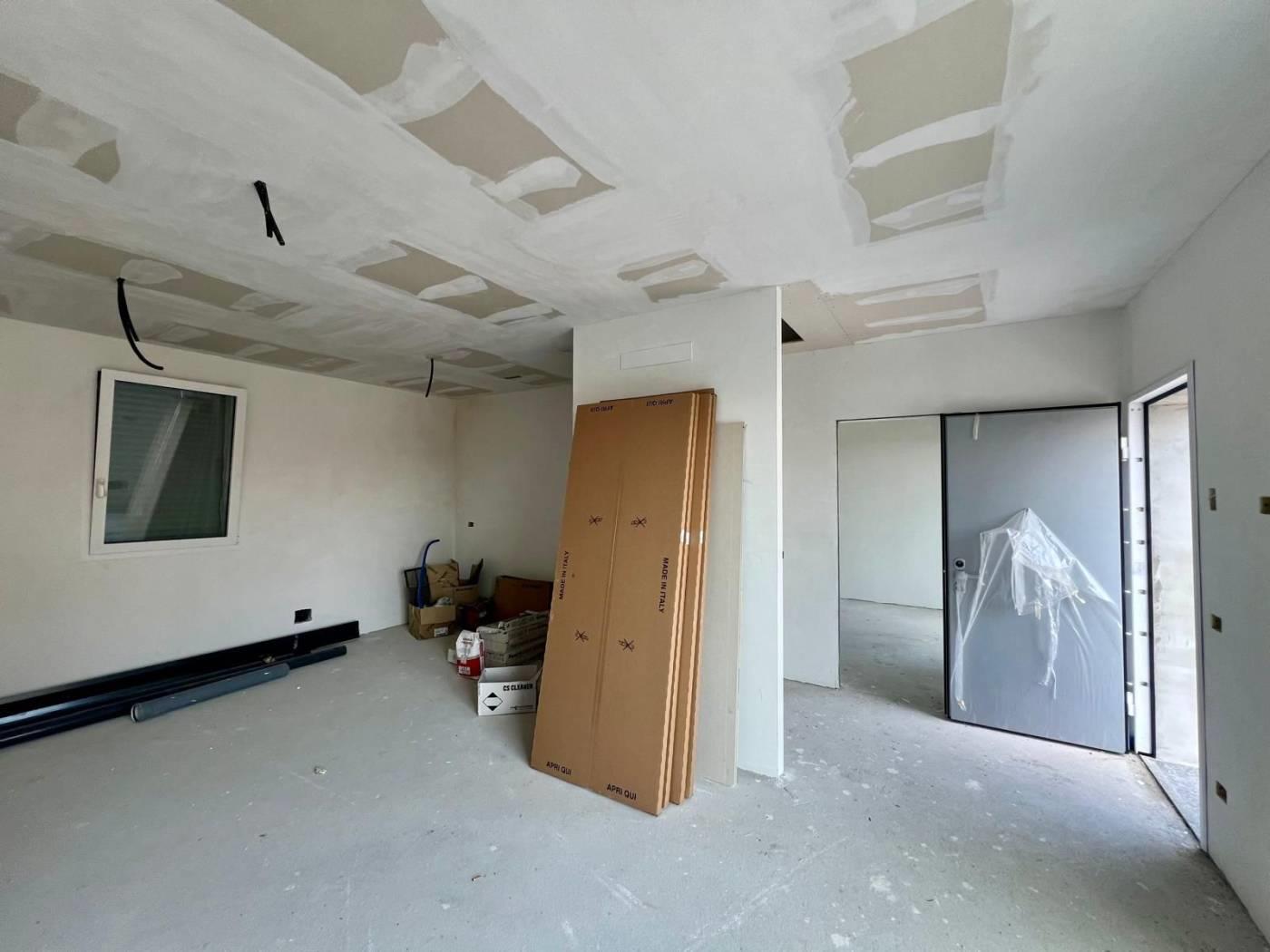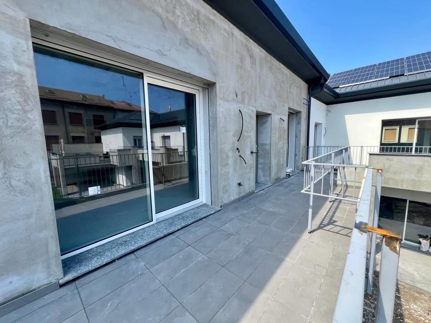 L’appartamento è composto da ingresso da terrazzo di 20 mq, ampio soggiorno con cucina a vista, disimpegno, camera matrimoniale con bagno, cameretta, ed un ulteriore bagno. La soluzione è collegata al sottotetto di altri 80 mq da rifinire con pavimentazione.