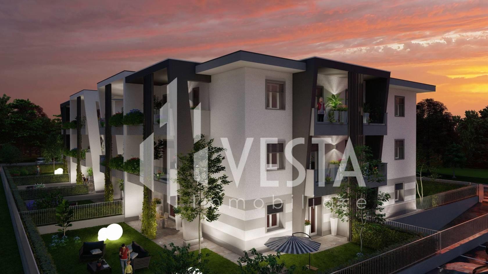 L'appartamento trilocale posto al piano terra con doppia esposizione, da rifinire internamente tramite capitolato di pregio (porte, pavimenti, sanitari con rubinetteria e rivestimenti) è così composto; tramite ingresso accediamo alla zona living con cucina a vista impreziosita dalla grande vetrata scorrevole, tramite disimpegno passiamo nella zona notte dove troviamo una camera matrimoniale, una seconda camera ed un bagno con sanitari sospesi, termoarredo e doccia.