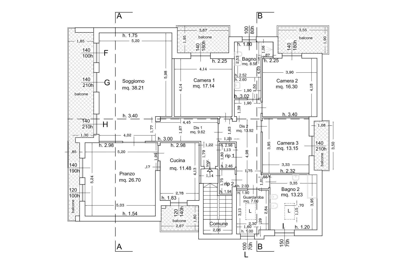 -Appartamento al piano primo, libero sui 4 lati e con quadrupla esposizione, di mq.214, composto da cinque locali oltre doppi servizi, cucina abitabile, tre camere da letto, quattro balconi per un totale di mq. 40 ca.