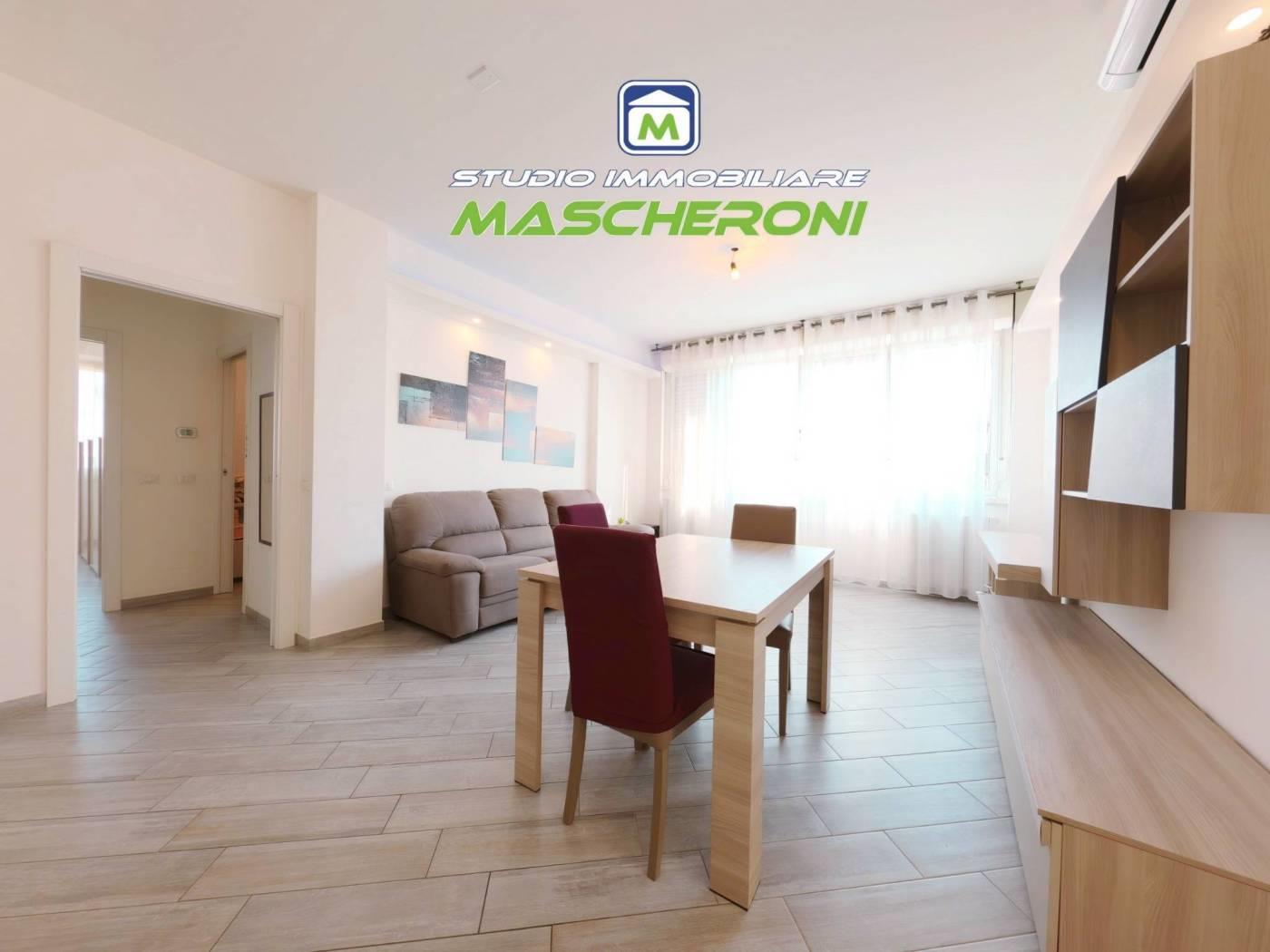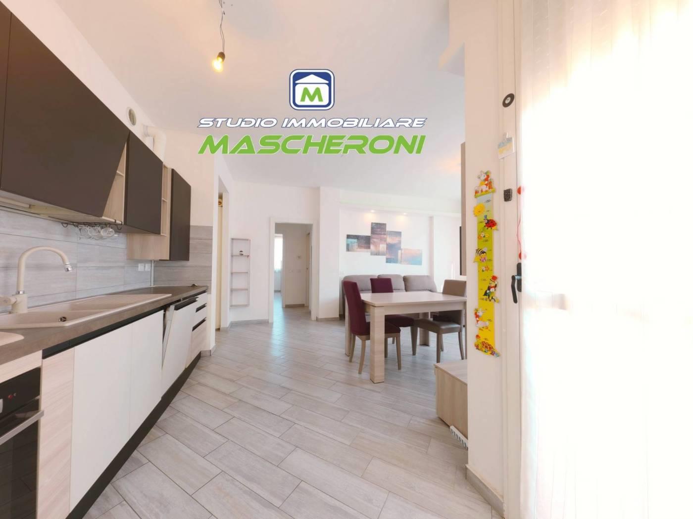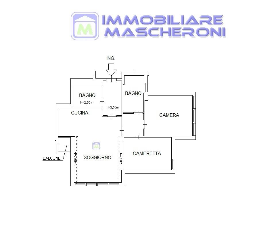 ingresso, soggiorno con cucina a vista e balconcino, disimpegno, camera matrimoniale, cameretta e doppi servizi (uno con vasca e l'altro con box doccia doppio).