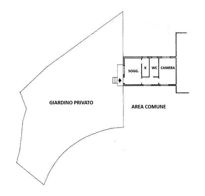 La disposizione interna comprende soggiorno con cucina a vista, camera matrimoniale, bagno finestrato e ingresso indipendente. Il giardino, facilmente fruibile, rappresenta uno spazio esterno ideale per momenti di relax.