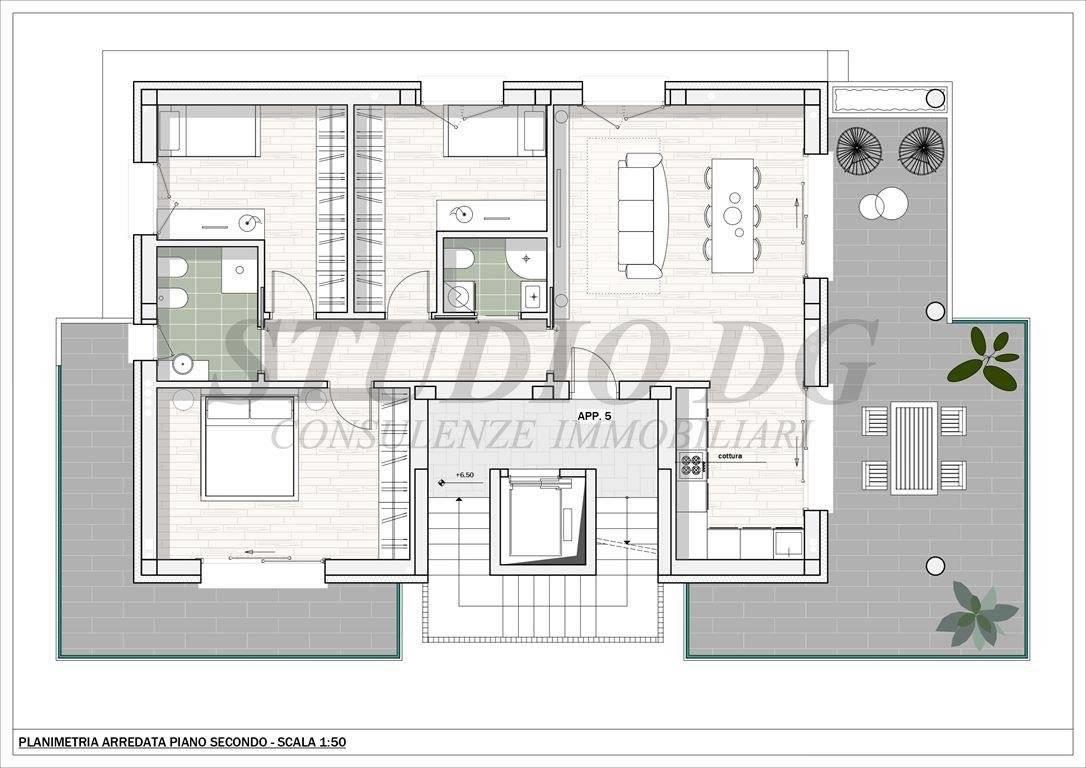 appartamento sito al piano secondo libero su quattro lati composto da ampio soggiorno con cucina semi abitabile, tre camere e due bagni. Dotato di due terrazzi per un totale di mq.60,46 e cantina.