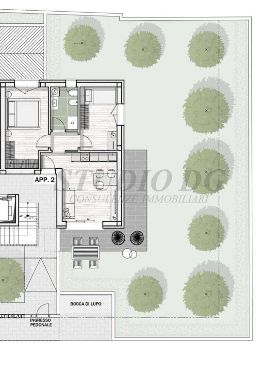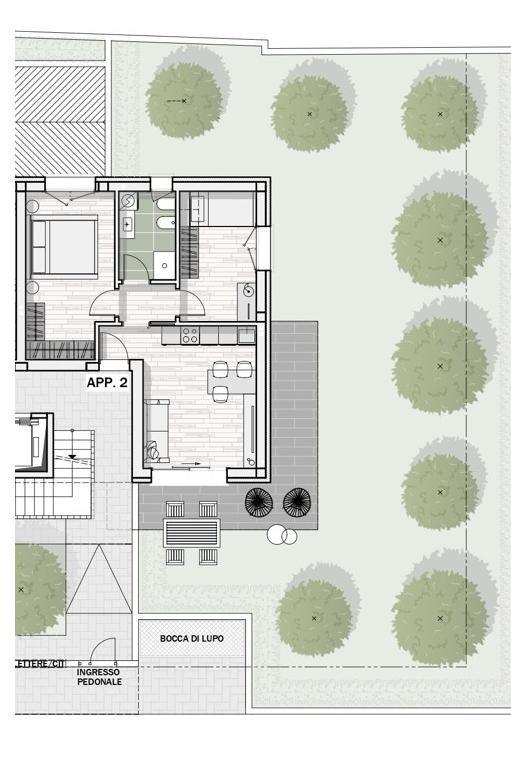 appartamento sito al piano terra composto da soggiorno con cucina a vista, due camere e bagno. Dotato di giardino privato mq.194 e cantina.