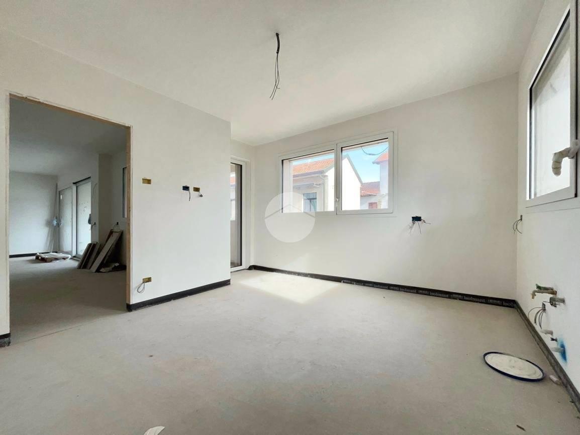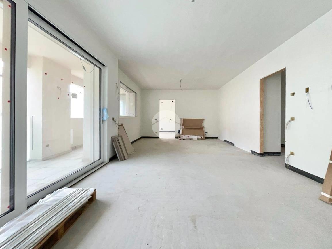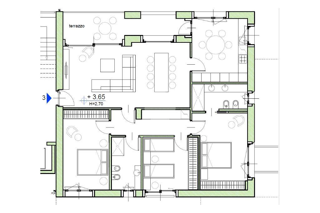 L'appartamento quadrilocale è composto da zona giorno con doppia ampia doppia porta finestra scorrevole per accedere al terrazzo coperto. Accesso al terrazzo anche dalla cucina abitabile. Zona notte composta dal bagno principale finestrato, due camere da letto e camera matrimoniale con bagno privato finestrato.