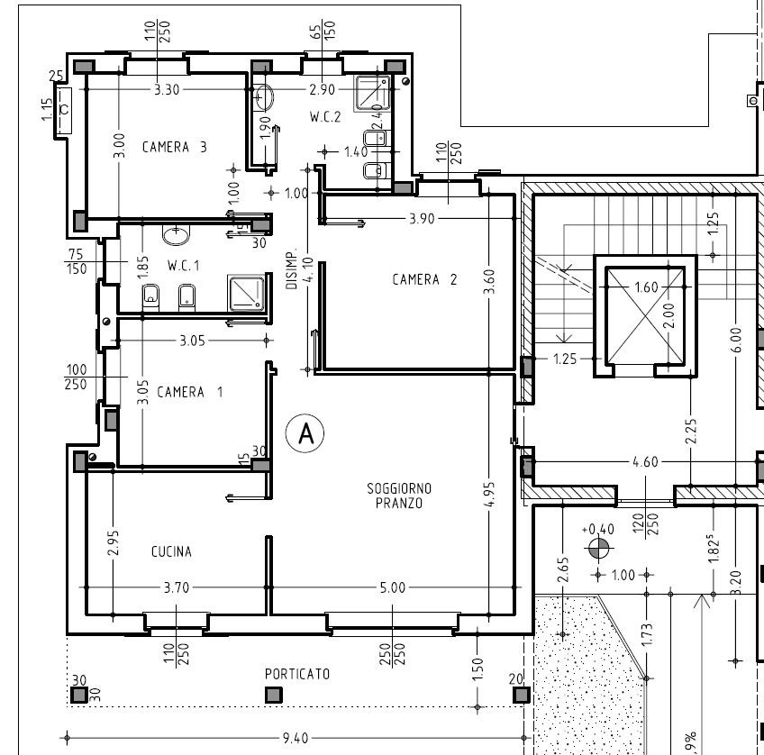 Es soluzione A – appartamento posto al piano terra di 106 mq, composto da soggiorno con cucina abitabile, disimpegno, tre camere e due bagni, 27 mq di porticato, 600 mq di giardino privato e 11,00 mq di cantina. Box doppio in larghezza di 33 mq compreso nel prezzo. €. 377.000,00