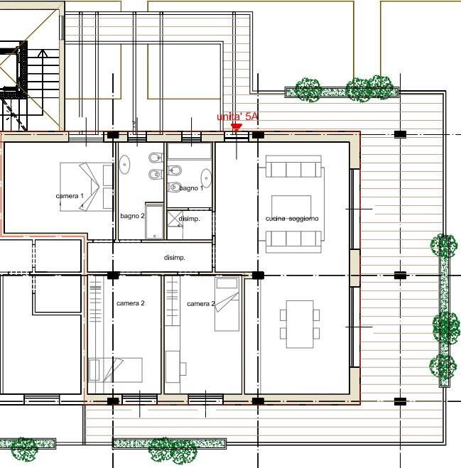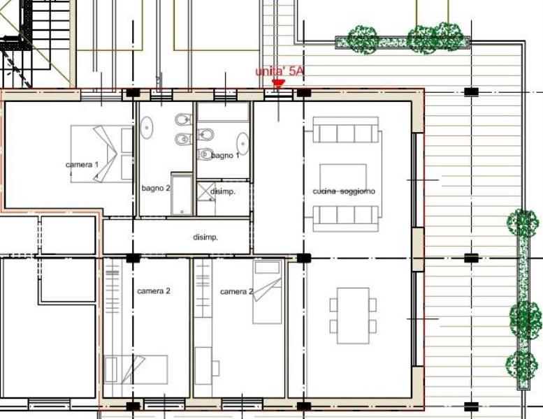 L'appartamento che presentiamo è un quadrilocale, posto al piano primo ed è così composto: l'ingresso si apre sull'ampia e luminosa zona giorno living con cucina a vista, completa di portafinestra con accesso al terrazzo. A servire la zona giorno abbiamo un primo bagno finestrato.
