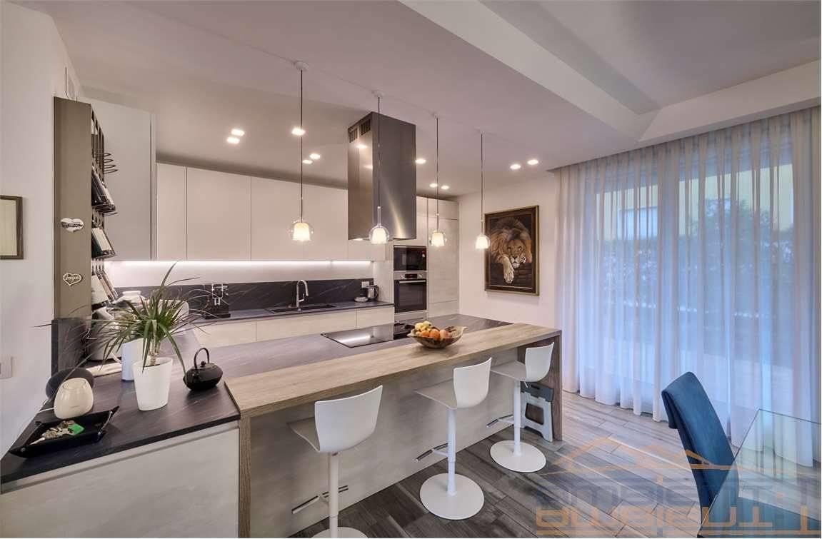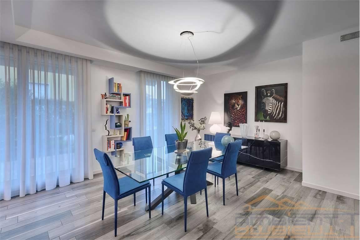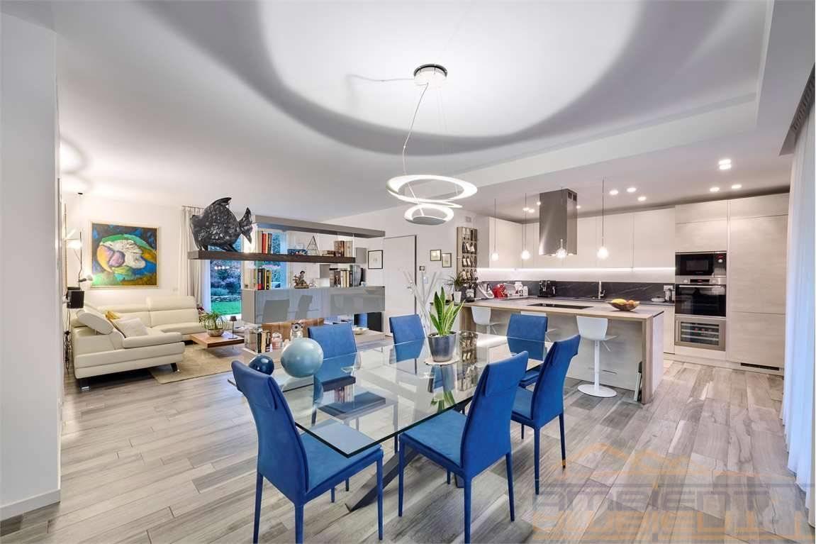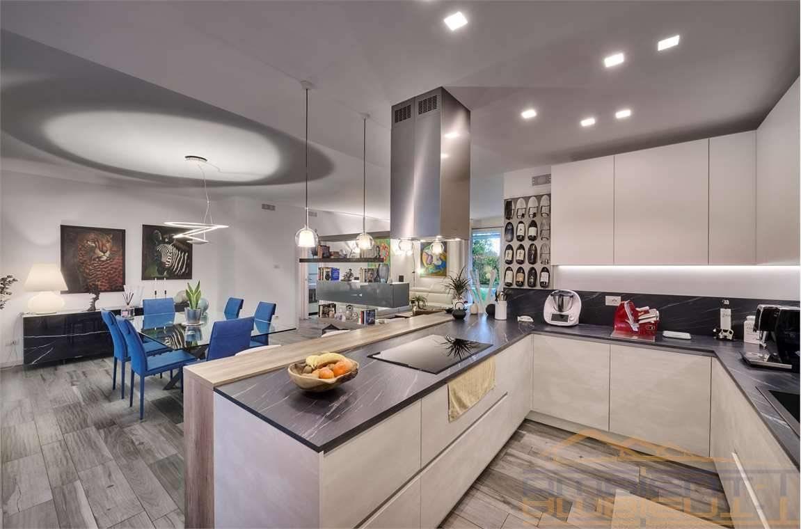 L’abitazione accoglie con una straordinaria zona giorno open space, ampia, luminosa e perfettamente organizzata, dove la cucina di design con grande isola centrale diventa il vero cuore della casa. L’isola, con piano di lavoro in gres effetto pietra e zona snack conviviale, è pensata per vivere la casa in modo moderno e funzionale. Gli elettrodomestici sono integrati nella composizione, mentre l’illuminazione con faretti e sospensioni di design valorizza l’ambiente rendendolo elegante e accogliente. La zona pranzo, impreziosita da un raffinato tavolo in vetro con sedute contemporanee, dialoga armoniosamente con il soggiorno, una spaziosa area living progettata per il relax quotidiano. Le grandi vetrate scorrevoli permettono una continuità visiva con il giardino e garantiscono un’eccellente luminosità naturale durante tutta la giornata.