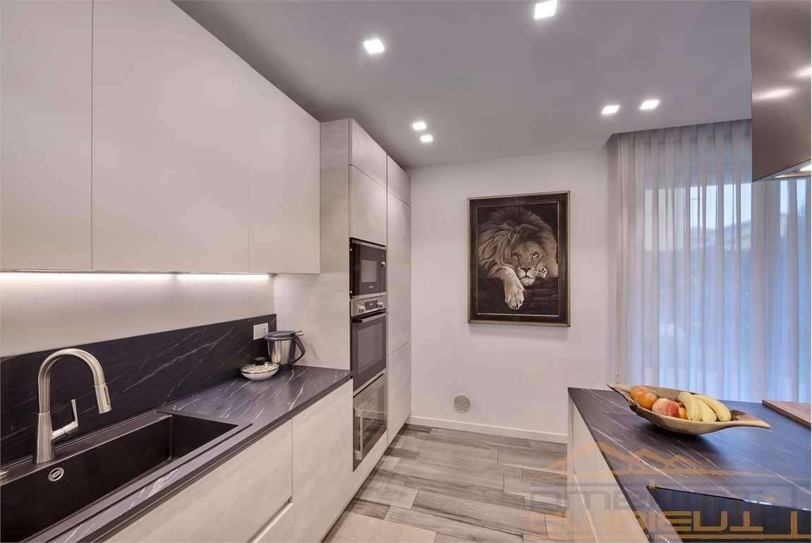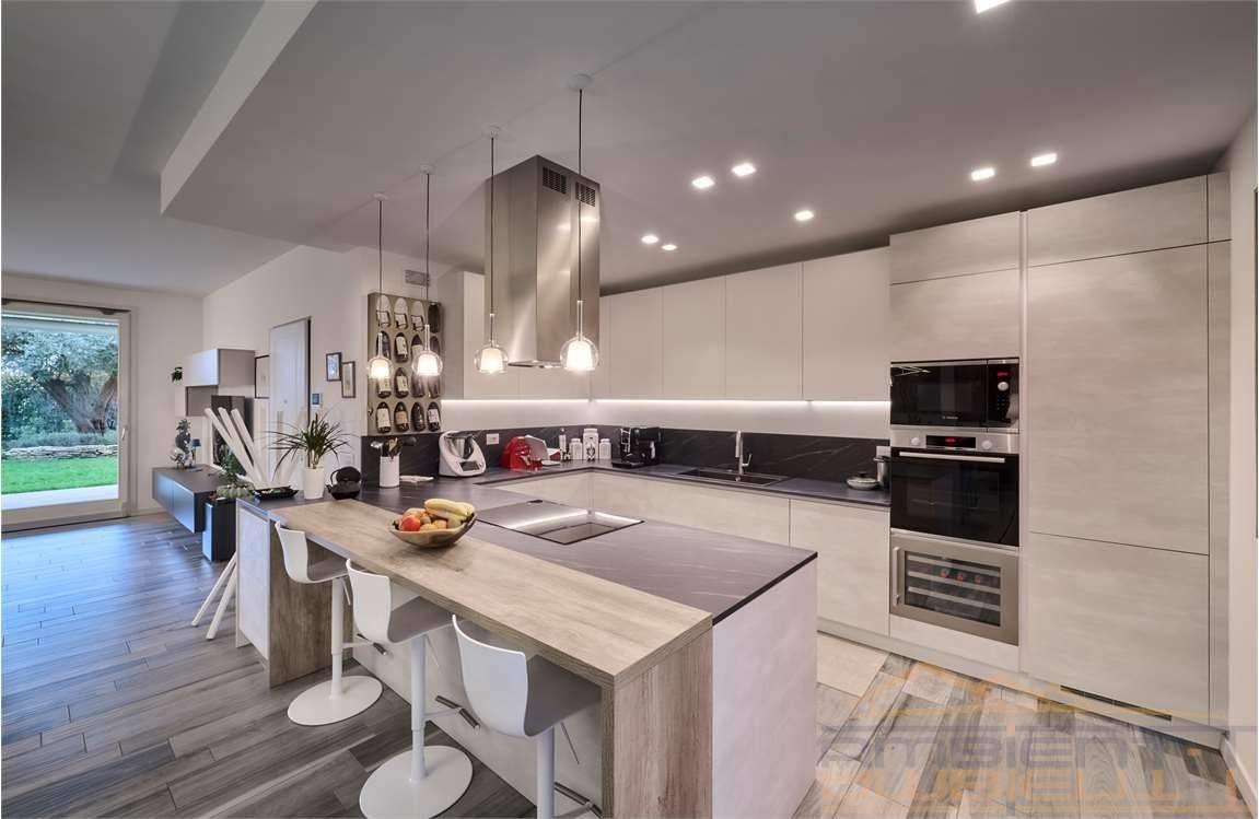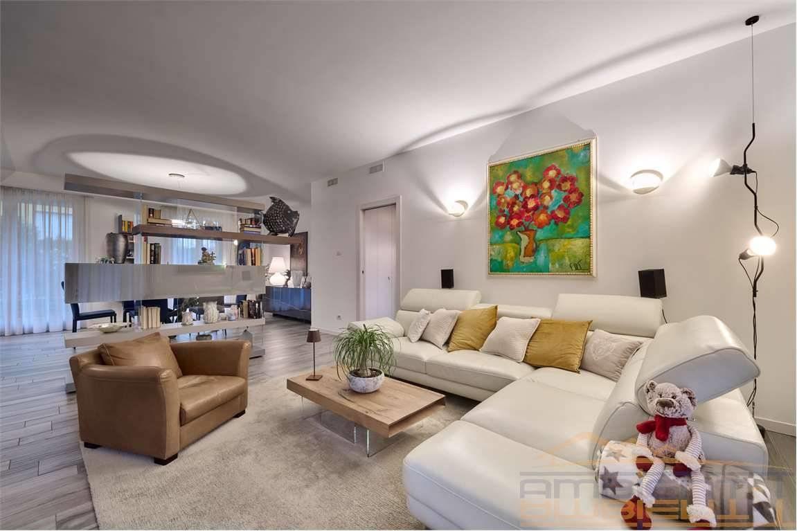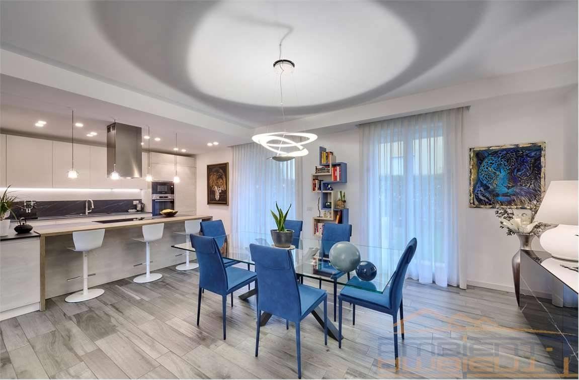 L’abitazione accoglie con una straordinaria zona giorno open space, ampia, luminosa e perfettamente organizzata, dove la cucina di design con grande isola centrale diventa il vero cuore della casa. L’isola, con piano di lavoro in gres effetto pietra e zona snack conviviale, è pensata per vivere la casa in modo moderno e funzionale. Gli elettrodomestici sono integrati nella composizione, mentre l’illuminazione con faretti e sospensioni di design valorizza l’ambiente rendendolo elegante e accogliente. La zona pranzo, impreziosita da un raffinato tavolo in vetro con sedute contemporanee, dialoga armoniosamente con il soggiorno, una spaziosa area living progettata per il relax quotidiano. Le grandi vetrate scorrevoli permettono una continuità visiva con il giardino e garantiscono un’eccellente luminosità naturale durante tutta la giornata.