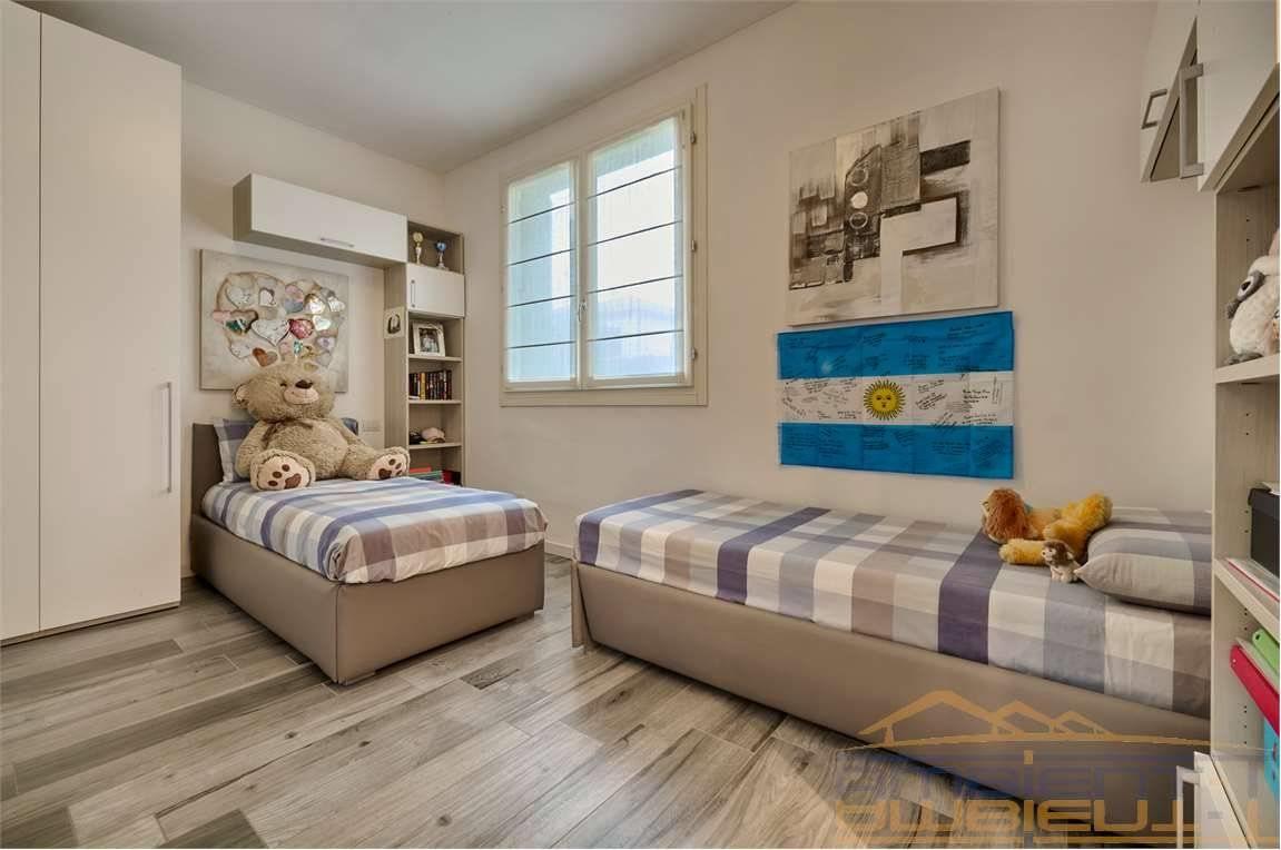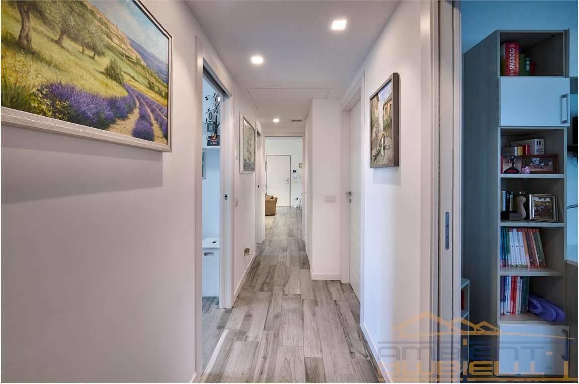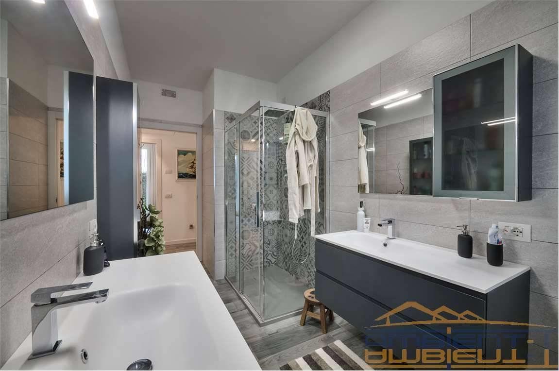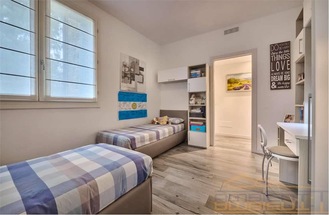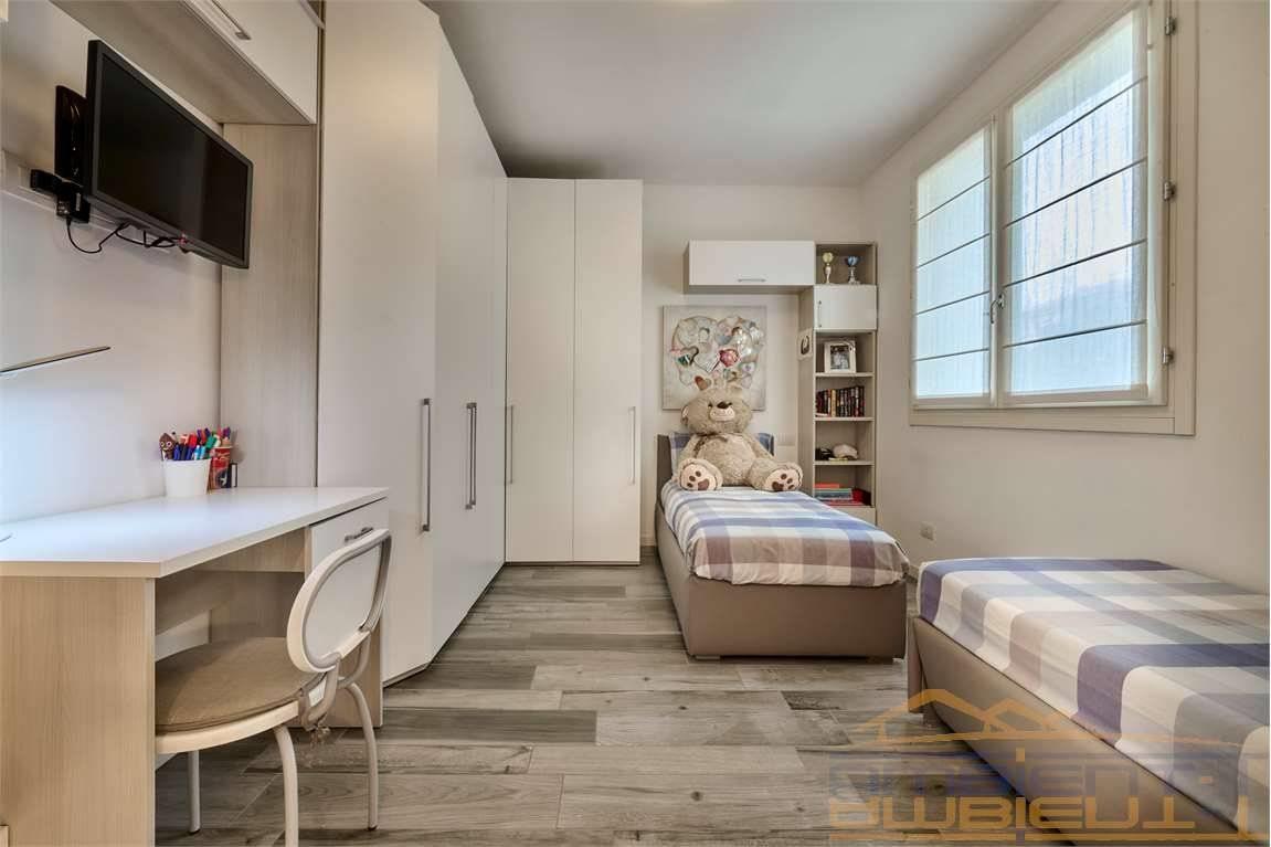 La zona notte è ben separata e pensata per offrire comfort e privacy. La camera matrimoniale padronale è ampia ed elegante e dispone di bagno privato en suite, creando una vera e propria suite domestica. Completano la zona notte due ulteriori camere di generose dimensioni, entrambe attualmente organizzate con due letti singoli e perfette come camere per figli, ospiti oppure studio. L’abitazione dispone complessivamente di tre bagni, tutti rifiniti con materiali moderni, sanitari sospesi e rivestimenti in gres porcellanato di grande formato, oltre ad un pratico locale lavanderia separato che garantisce funzionalità e ordine nella gestione quotidiana della casa.