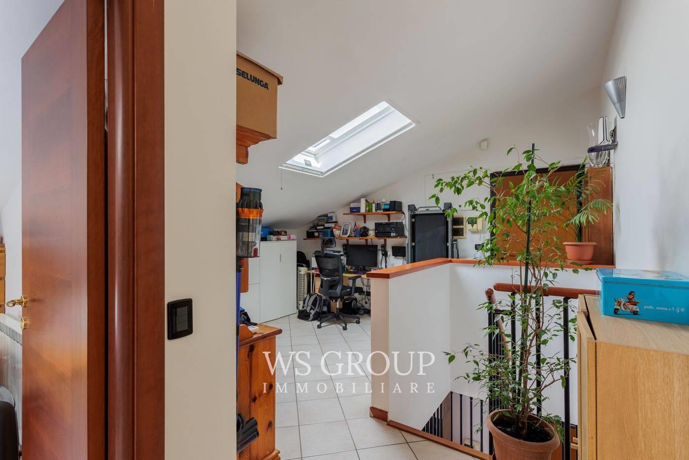 Dalla scala posta sul lato del soggiorno, accediamo al piano sottotetto, dove troviamo un primo spazio ora adibito a studio, due ampie camere ed il secondo bagno anch’esso con finestra (velux).
