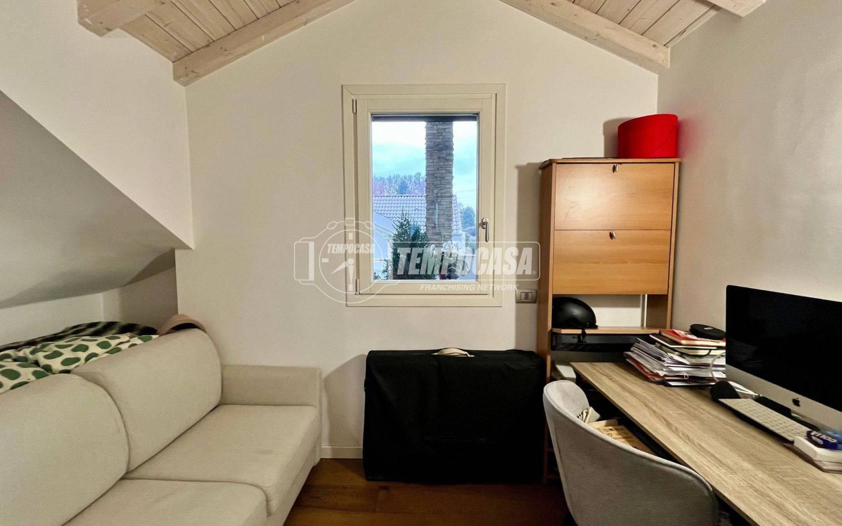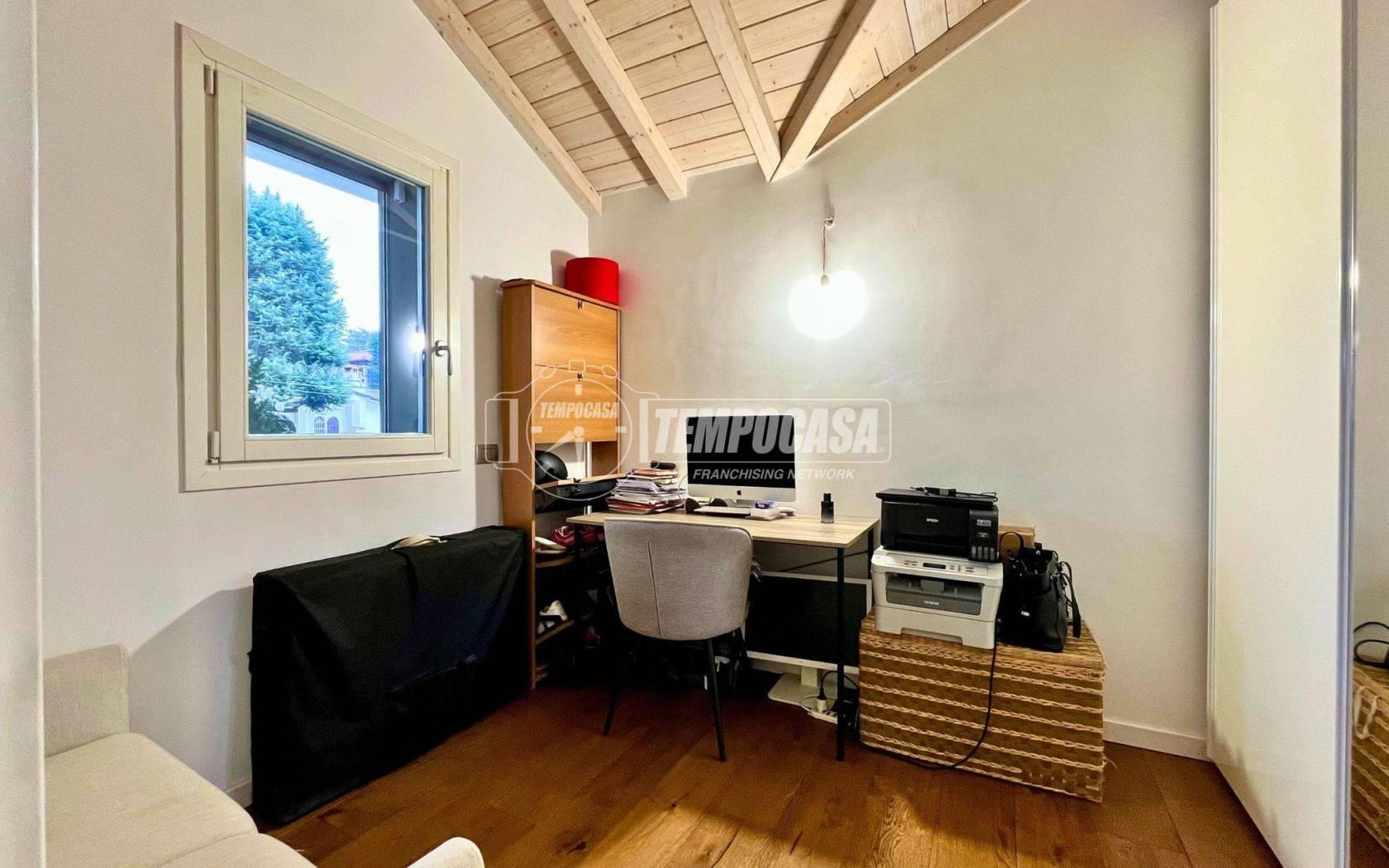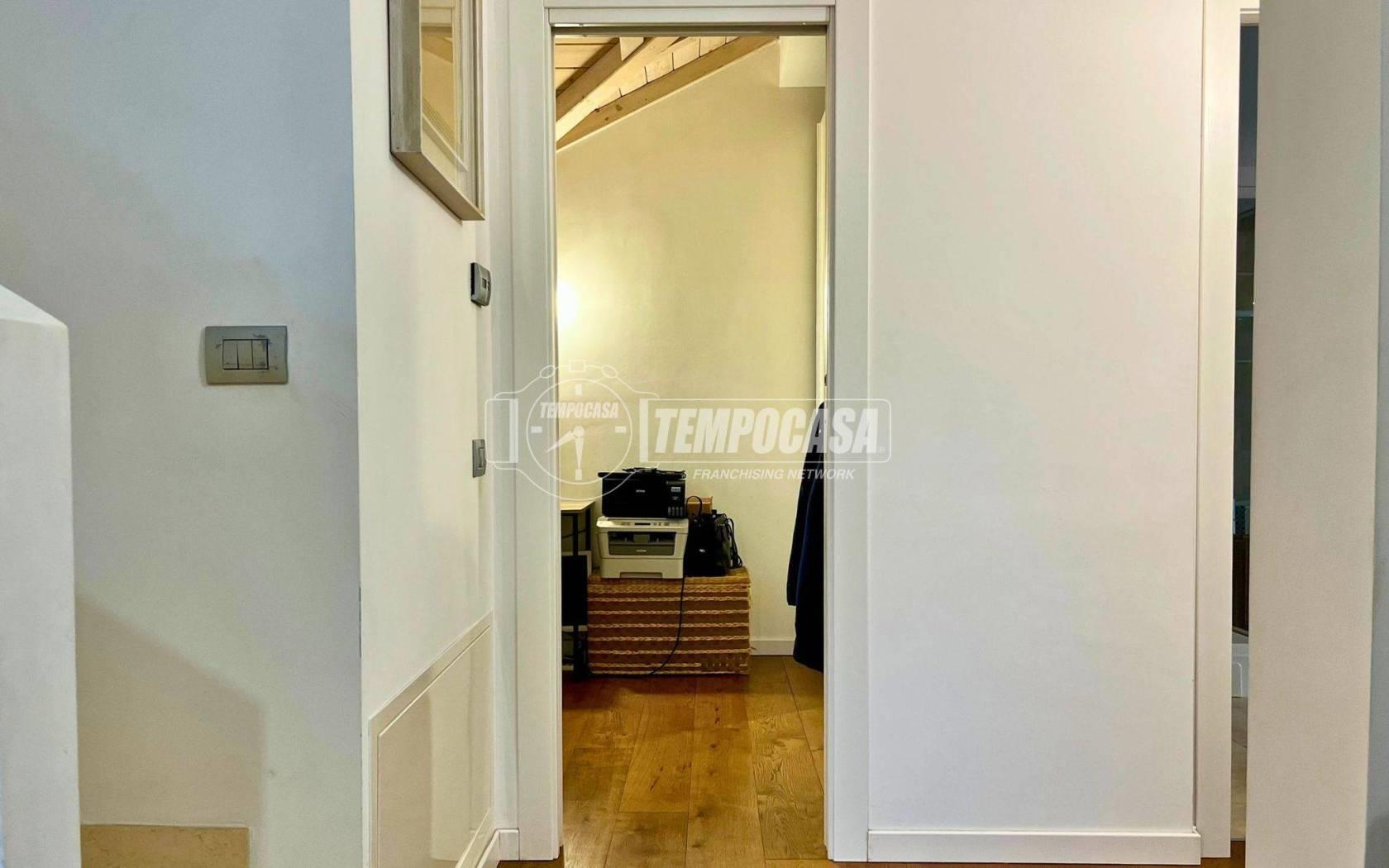 Tramite una scala di design, arricchita da un raffinato corrimano in vetro che conferisce modernità e leggerezza all’ambiente, si accede al livello superiore, dedicato alla zona notte. Qui un comodo disimpegno — perfetto anche come zona studio — è valorizzato da una pratica armadiatura su misura.