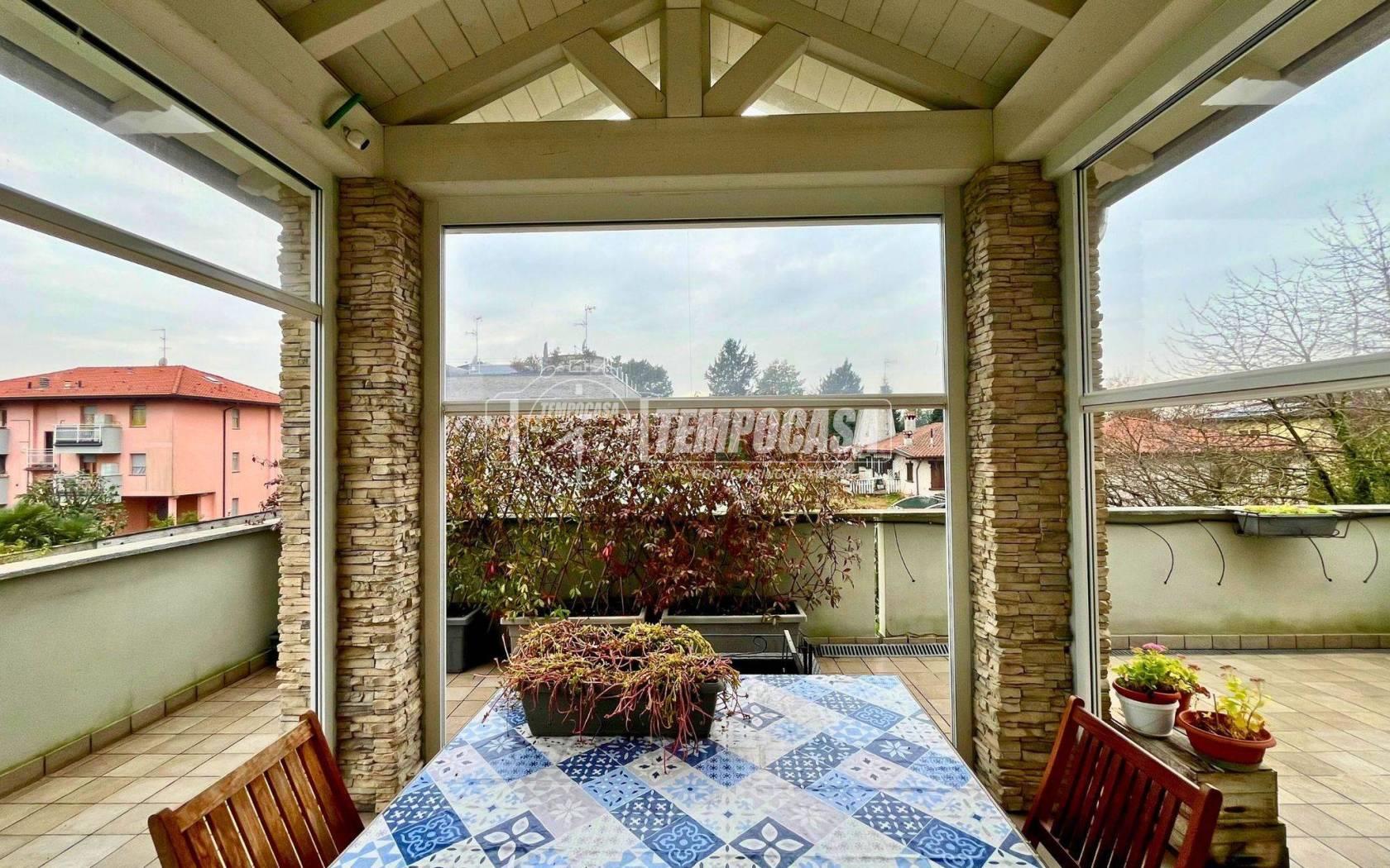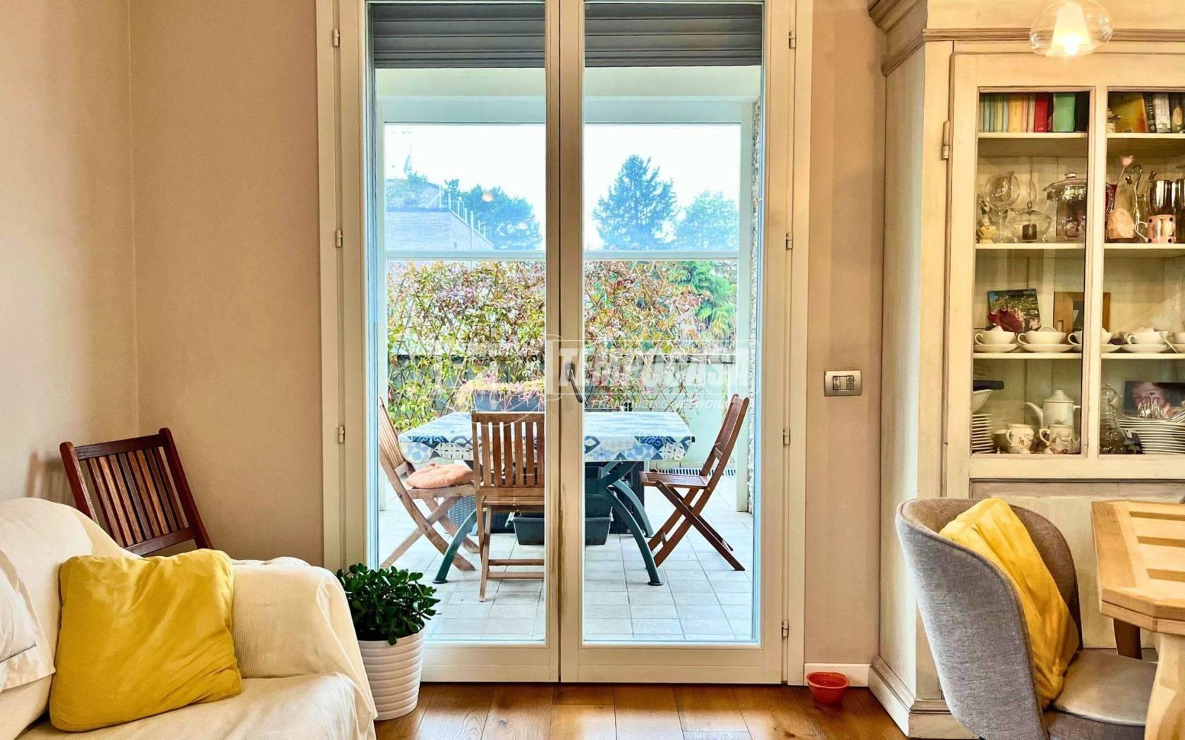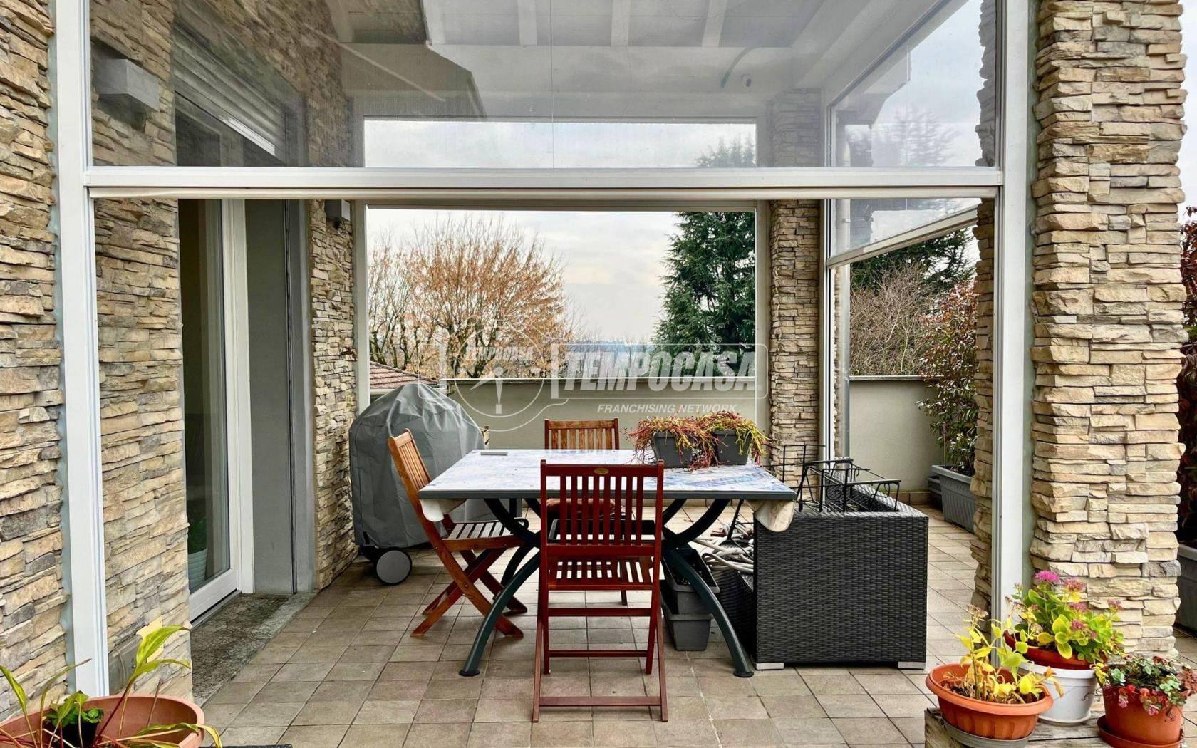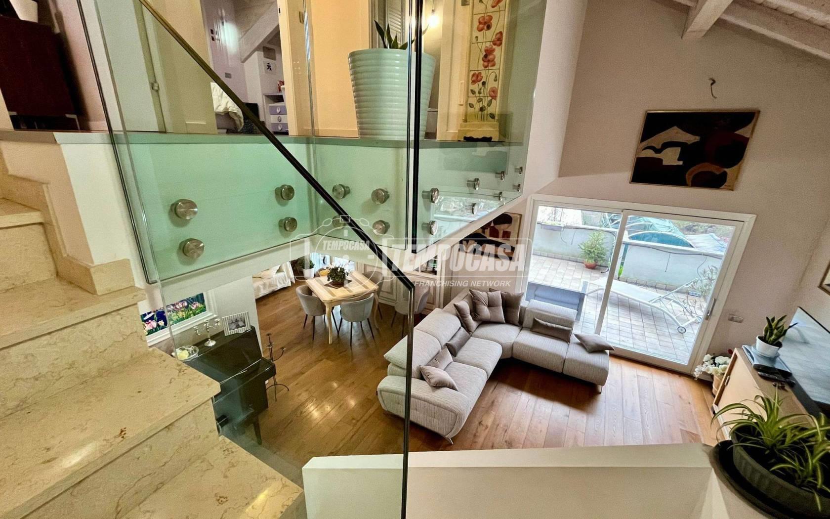 Al primo piano si sviluppa la zona giorno, composta da un ampio e luminoso soggiorno con grande portafinestra che si apre su un meraviglioso terrazzo, ideale per momenti di relax all’aperto. La zona pranzo e la cucina abitabile — con finestra affacciata sul verde — sono disposte in modo aperto, ma visivamente separate dall’area living, per garantire funzionalità. Una seconda portafinestra conduce alla veranda del terrazzo: uno spazio esterno che si affaccia su tre lati, sfruttabile tutto l’anno grazie a chiusure in tende trasparenti. Sempre su questo livello troviamo una camera da letto e un grande bagno, quest'ultimo con affaccio diretto al terrazzo
