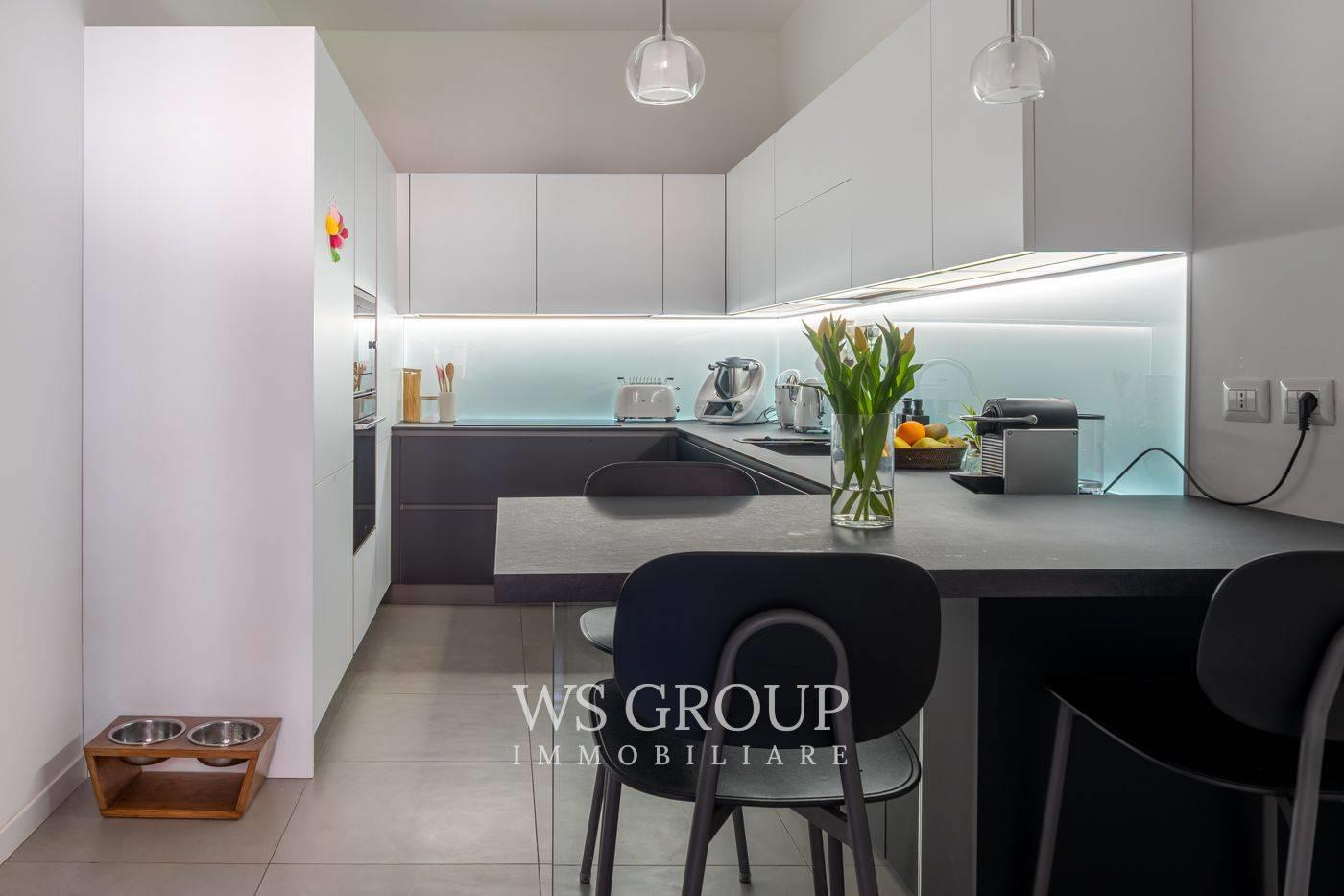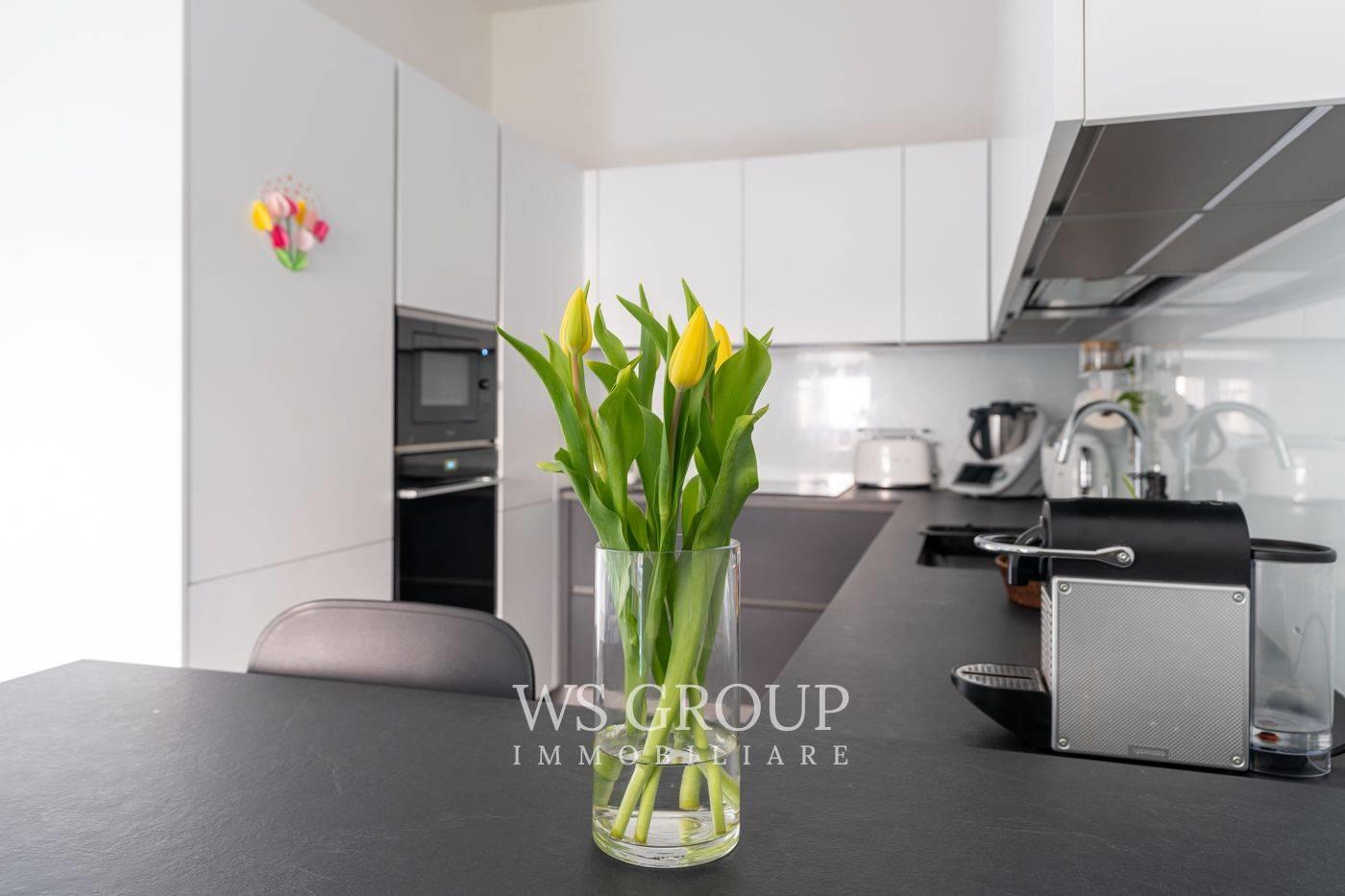 La cucina abitabile, completamente rinnovata, è collegata alla zona di servizio composta da bagno, lavanderia e studio, ambienti funzionali che possono essere utilizzati anche come spazio di lavoro o stanza di servizio.