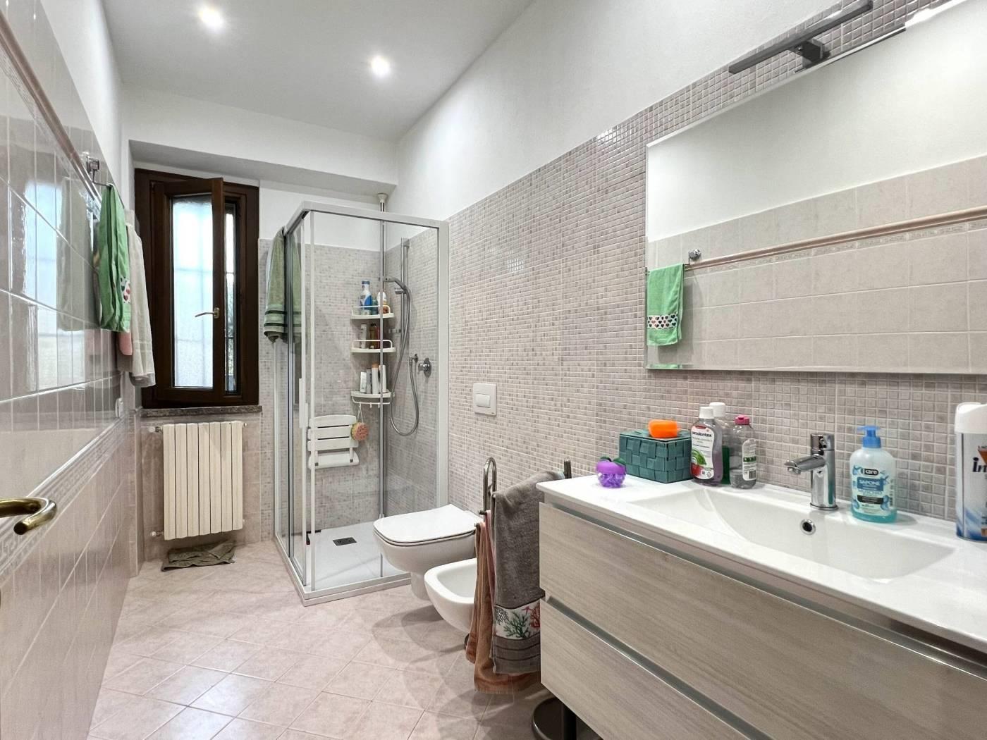 A completamento della proprietà è compreso un box doppio in larghezza dotato di due serrande. Due locali ad uso ripostiglio posti al piano sottotetto sono accessibili con l'uso di una scala dal vano comune dove sono alloggiati i contatori.