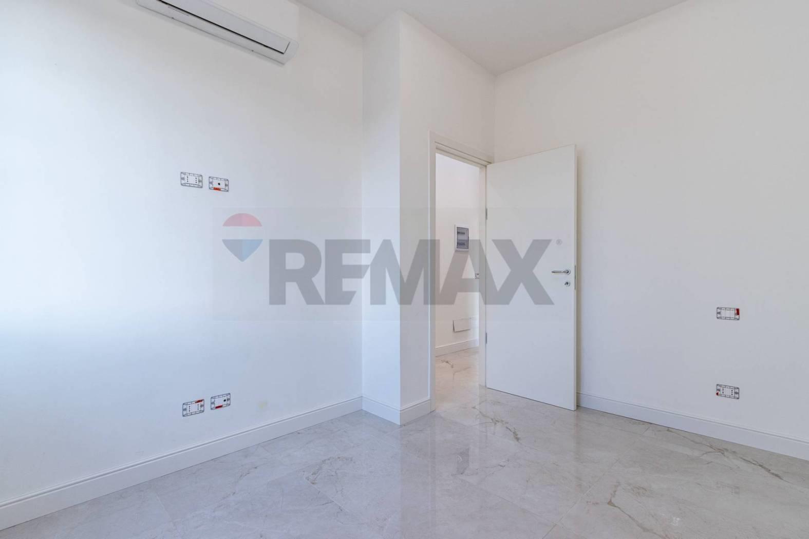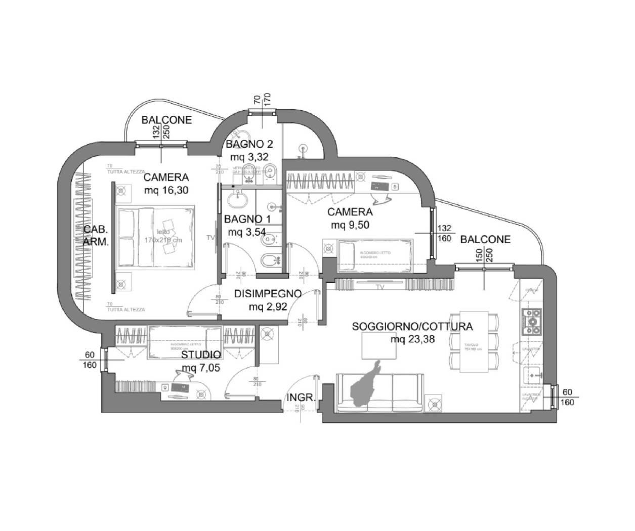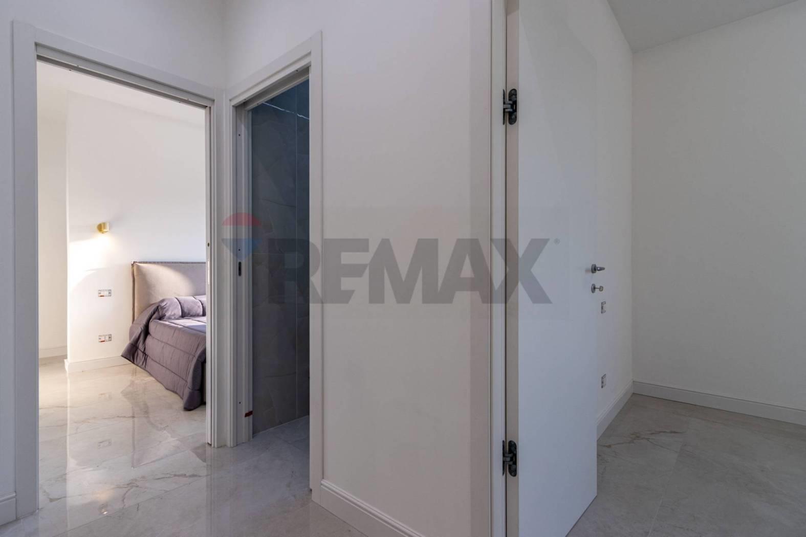 Entrata direttamente su ampio e luminoso soggiorno con cucina a vista e servito da balcone, a sinistra vano studio o terza cameretta, dal disimpegno si accede alla zona notte ospitante una camera matrimoniale con zona dedicata ad una cabina armadio di generosa metratura, vano servito da balcone e con bagno finestrato in camera, seconda camera da letto e ampio bagno con box doccia.