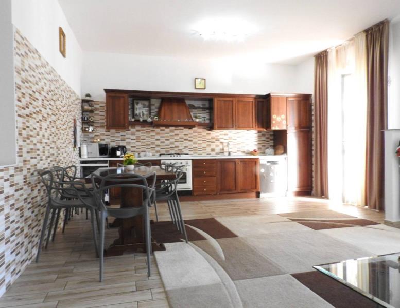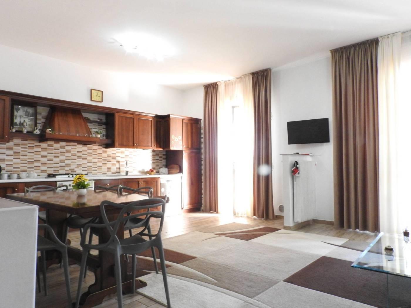 La cucina è a vista, perfetta per chi ama avere uno spazio unico e luminoso.