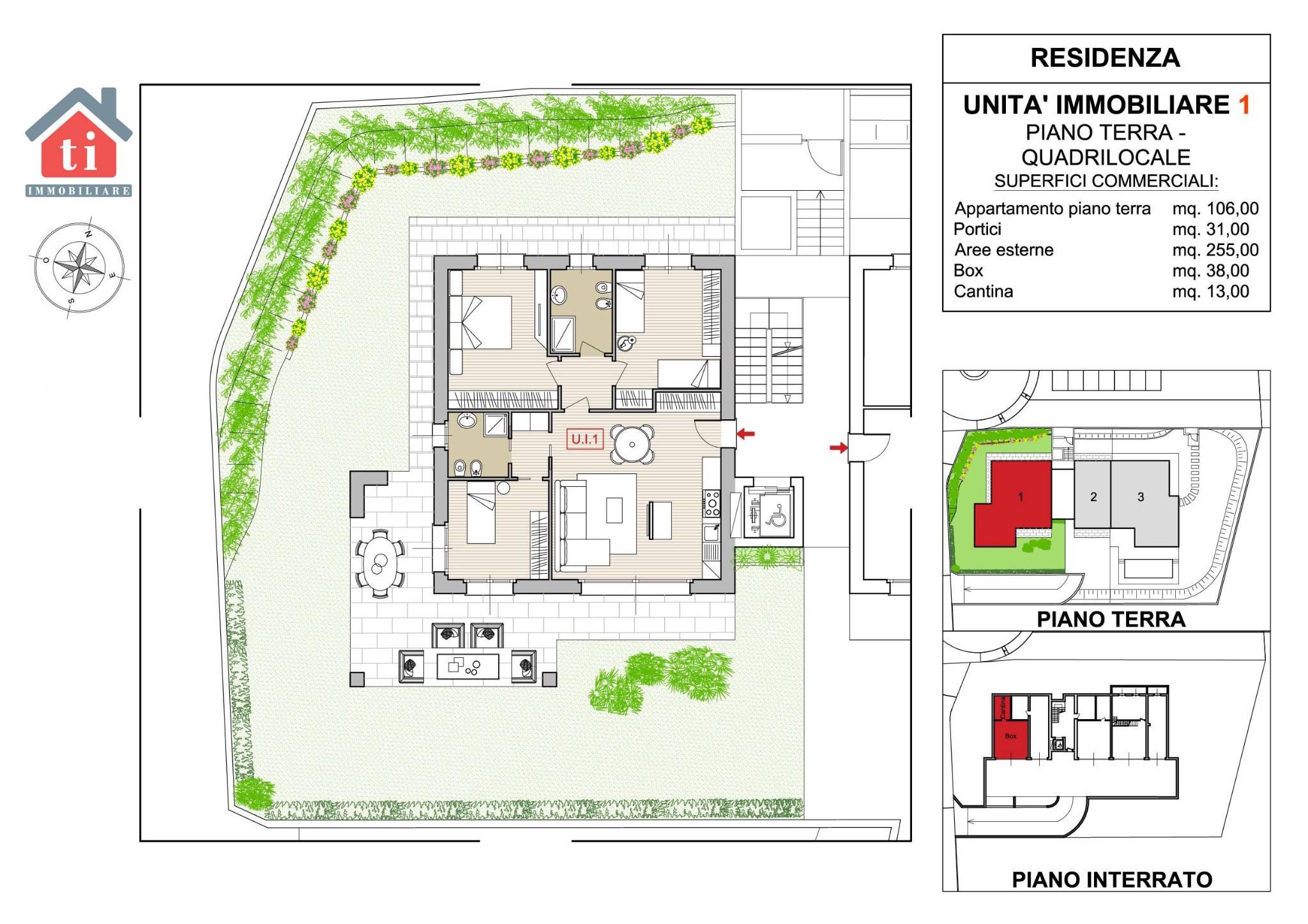 3 O 4 LOCALI posto al piano terra con giardino privato e portico. Box doppio in larghezza di mq. 38 e annessa ampia cantina di mq. 13 da contabilizzare a parte ad € 45.000,00 .