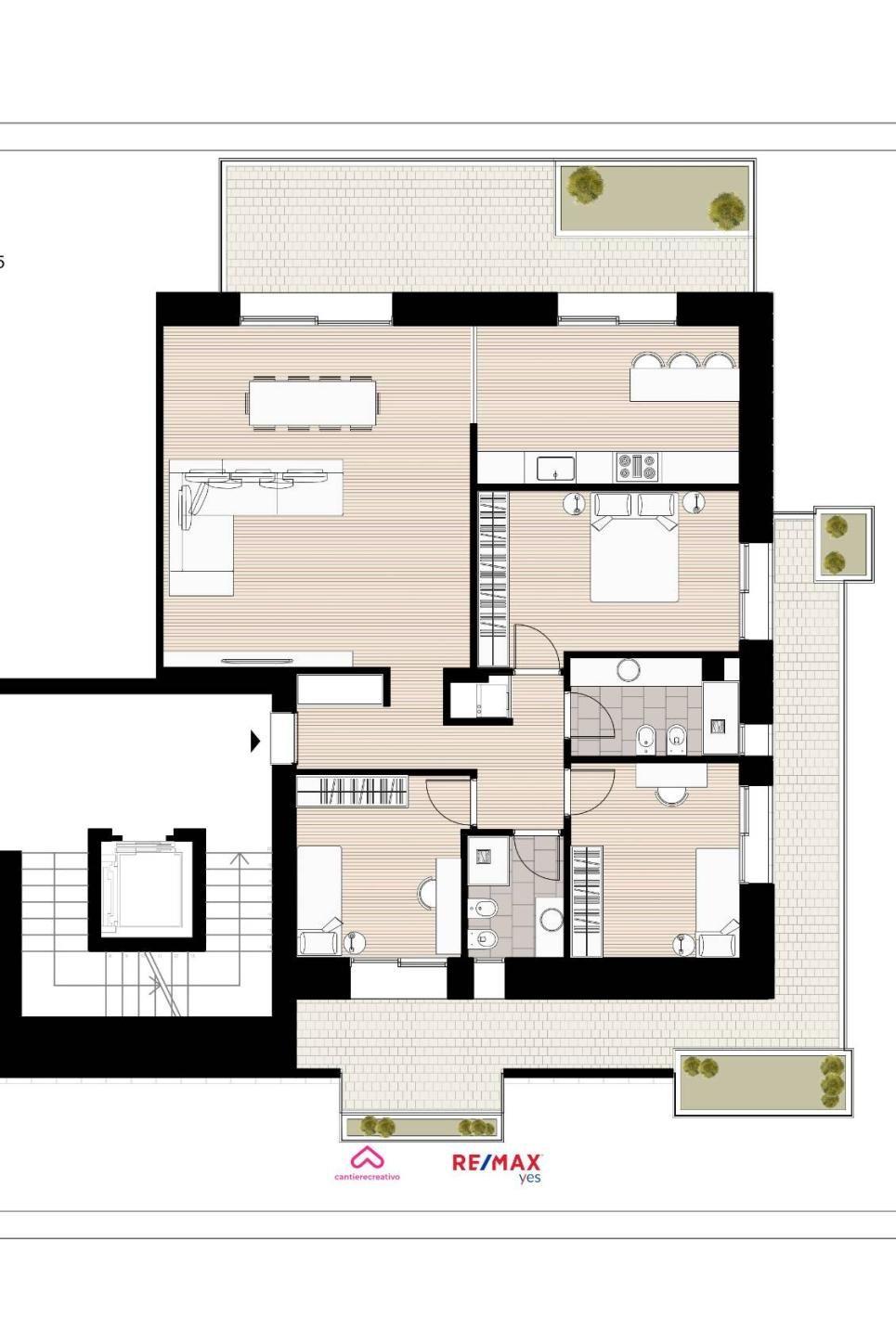 Proponiamo quadrilocale di nuova realizzazione così composto: ingresso, ampio soggiorno con cucina a vista, con accesso al terrazzo coperto. Dall'ingresso si accede anche al disimpegno dove abbiamo due camere, una camera matrimoniale e due ampi servizi finestrati, tutti gli ambienti della zona notte affacciano sul secondo terrazzo con accesso dalle tre camere.