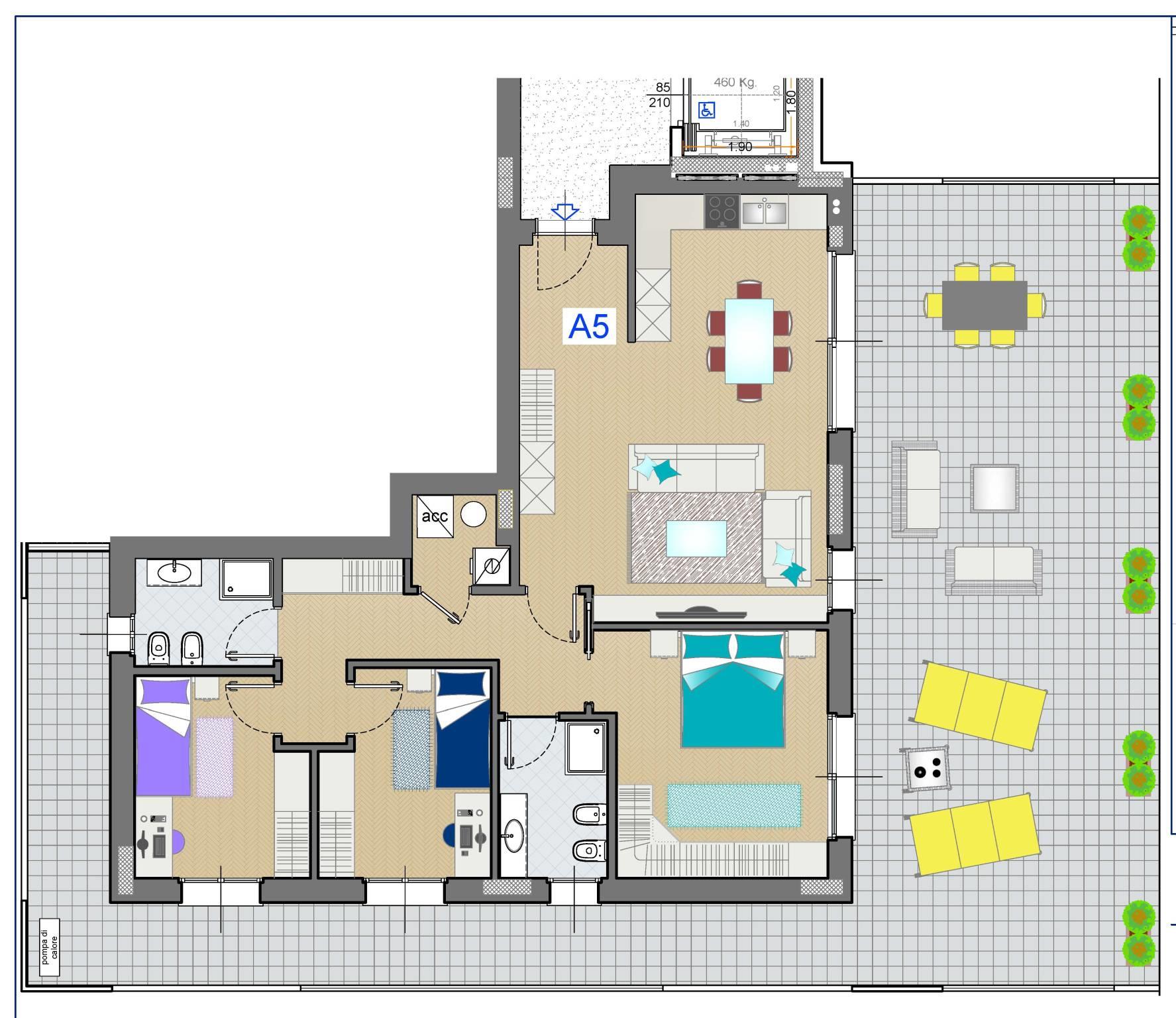 La soluzione qui proposta è quattro locali al primo piano progettato per offrire confort, funzionalità e spazi vivibili: l' ingresso si apre su uno spazioso soggiorno con angolo cottura con accesso diretto al terrazzo di circa 70 mq comunicante col balcone a girare sugli altri lati d'affaccio, il disimpegno conduce alle tre camere da letto, doppi servizi e al ripostiglio.