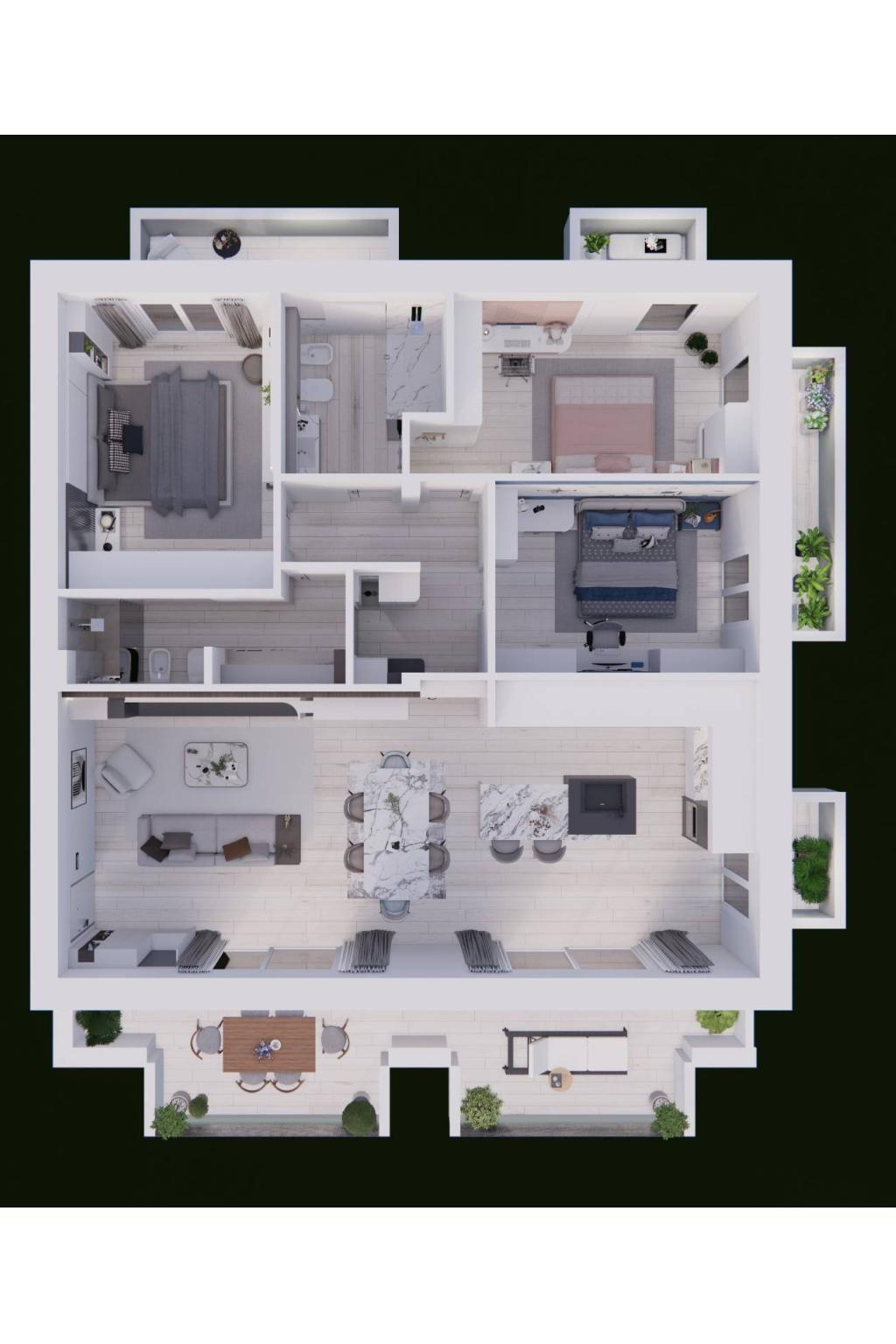 Immagina di vivere in appartamenti luminosi e spaziosi, con ampi giardini esclusivi al piano terra, perfetti per momenti di relax all'aperto o per far giocare i tuoi bambini in totale sicurezza. Al primo piano, invece, potrai goderti grandi terrazzi ideali per aperitivi al tramonto, cene con amici o semplicemente per ammirare il paesaggio circostante.