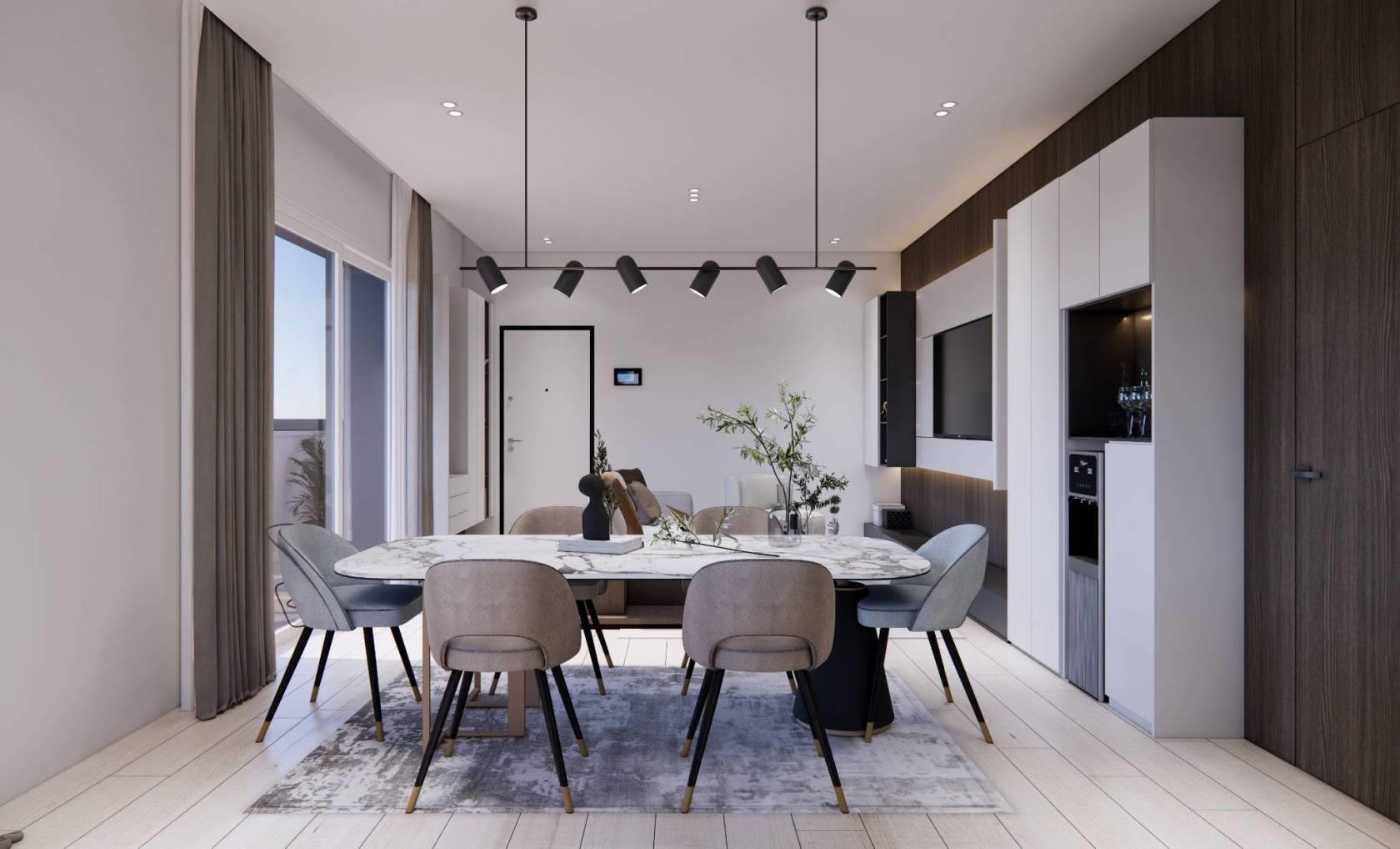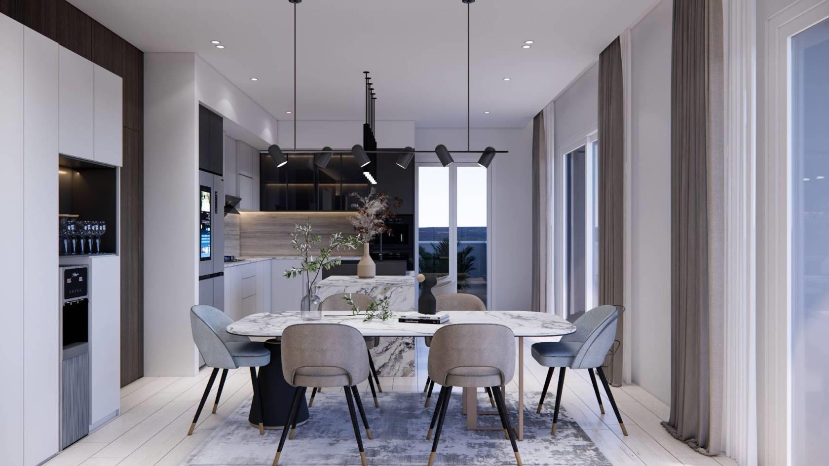La residenza si distingue anche per i dettagli di stile: facciate in intonaco e pietra, grandi vetrate nelle zone living e terrazzi moderni, che conferiscono un aspetto contemporaneo e raffinato. La qualità costruttiva è al massimo livello, con cappotto termico, muri di confine con doppio tavolato e isolamento in lana di roccia, garantendo un comfort termico eccellente e risparmio energetico.