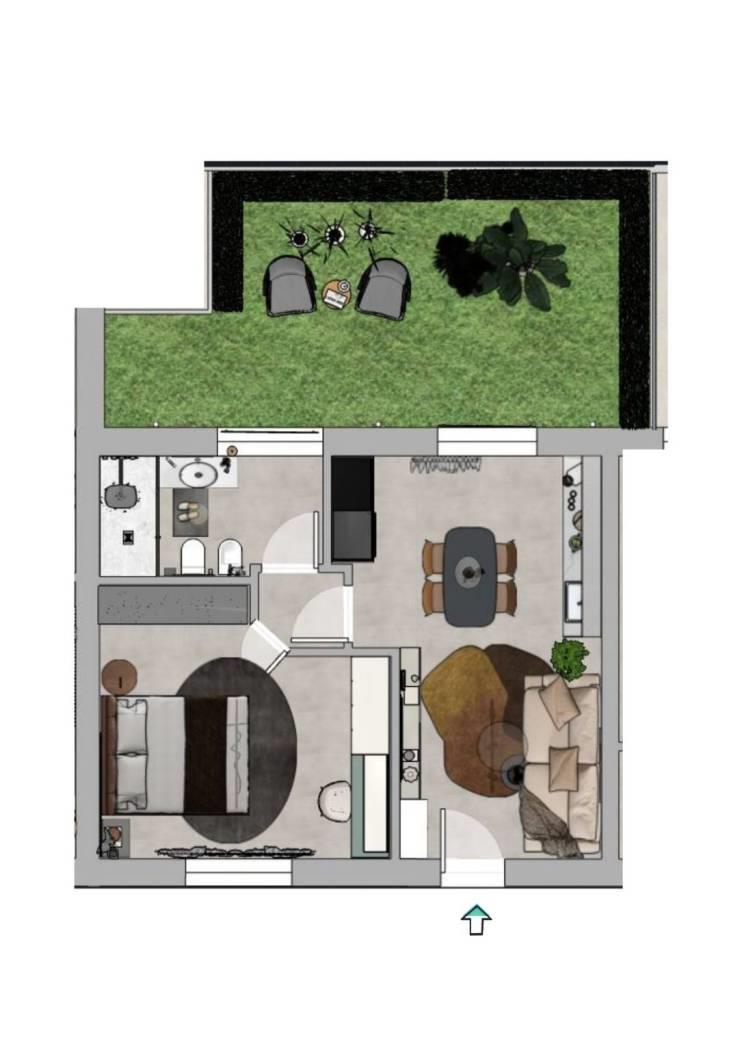 APPARTAMENTO 1) Bilocale e servizi sito al piano terra, composto da ingresso, soggiorno con angolo cottura, disimpegno, camera matrimoniale e bagno. Valore aggiunto il giardino privato al quale si accede dalla zona giorno. Incluso nel prezzo un posto auto e una comoda cantina.