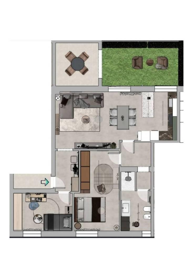 APPARTAMENTO 4) Trilocale sito al piano terra, composto da ingresso, soggiorno con angolo cottura, cameretta, disimpegno, camera matrimoniale e bagno. Valore aggiunto il giardino privato con portico. Un posto auto e la cantina inclusi nel prezzo.