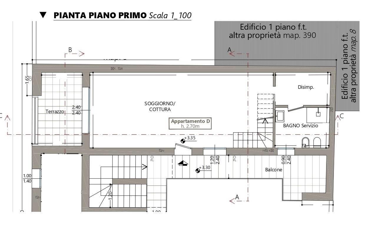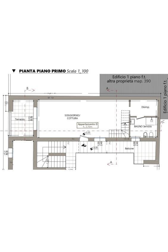 Piano primo: ampia zona living con cucina a vista e affaccio su terrazzino, comodo disimpegno con zona lavanderia,