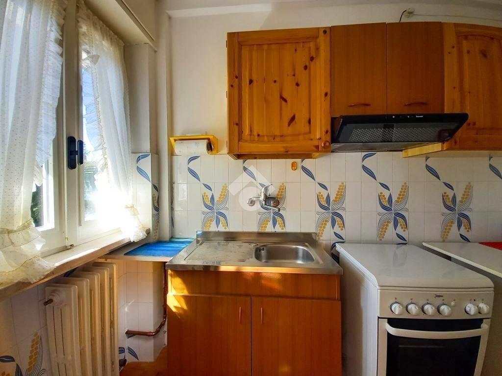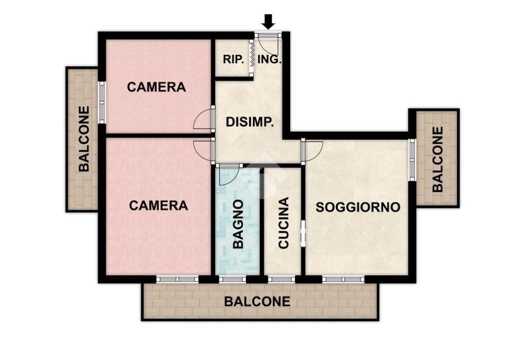 All'interno presenta ambienti ampi e luminosi, articolati su di un grande disimpegno d'ingresso ed in particolare: il soggiorno dotato di cucinotto separato, due spaziose camere da letto, un pratico ripostiglio ed il bagno; quest’ultimo, provvisto di finestra e vasca, è completo di tutti i sanitari e di attacco lavatrice.
