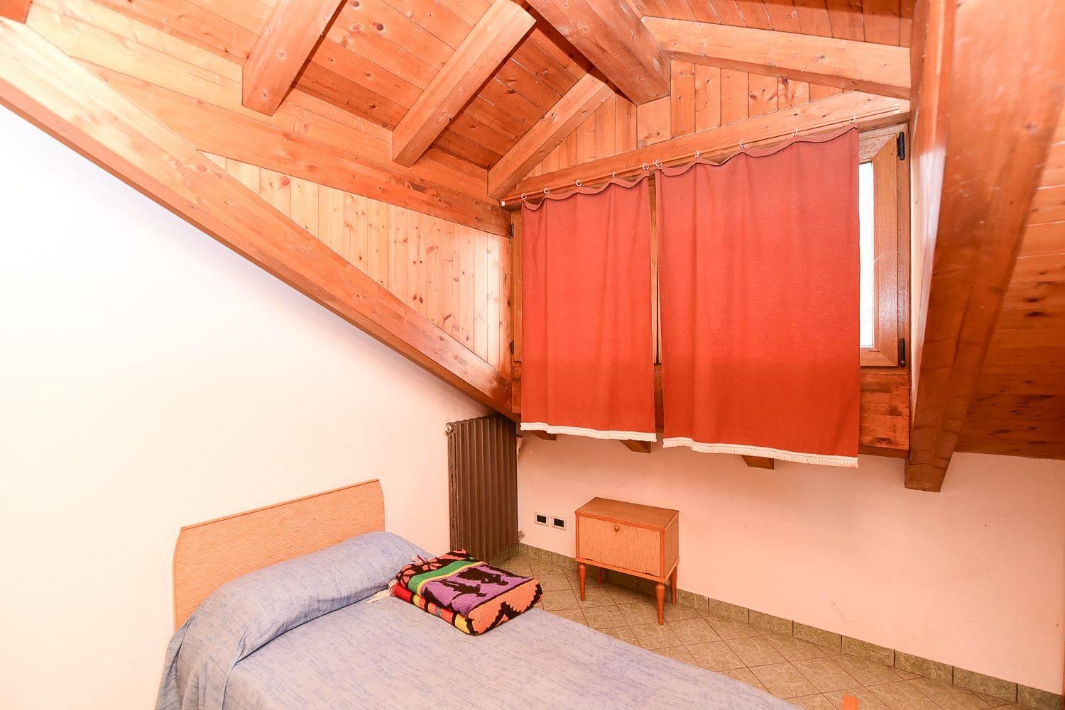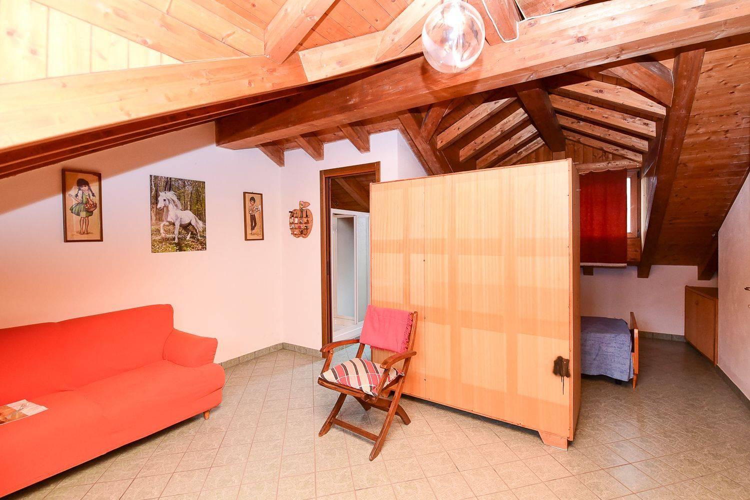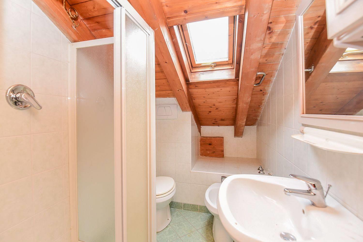 La scala interna porta al primo piano, dove troviamo la mansarda accompagnata da un secondo bagno che aggiunge praticità e comfort.