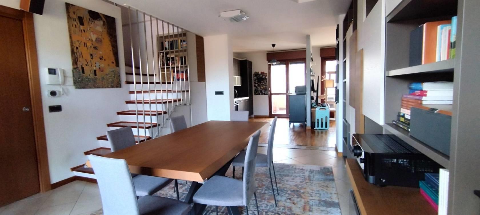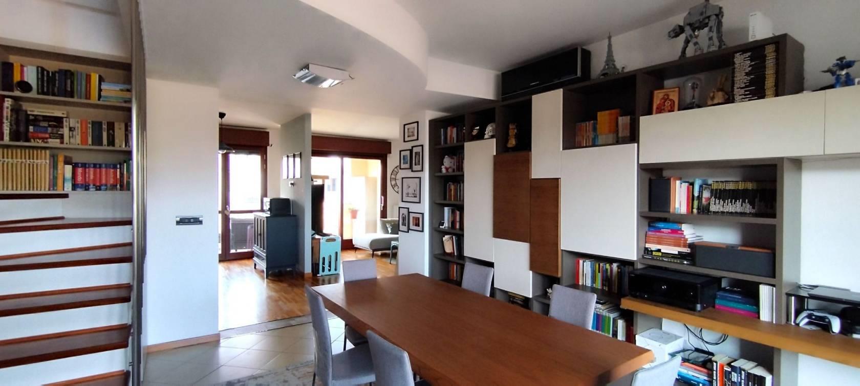 Da scala interna, di design moderno in parquet, perfettamente integrata nella zona living, che dona carattere e movimento, accediamo al piano superiore, dove sono presenti una camera e un bagno, attualmente utilizzato a cabina armadio.