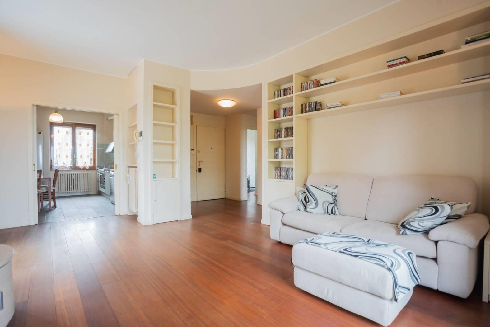 La pavimentazione è in parquet di primaria fattura ovunque, tranne in cucina e nel bagno. I serramenti sono in legno con doppi vetri e persiane di recente sostituzione. L’appartamento è completo di impianto di antifurto ed aria condizionata, porta blindata di ingresso e videocitofono.