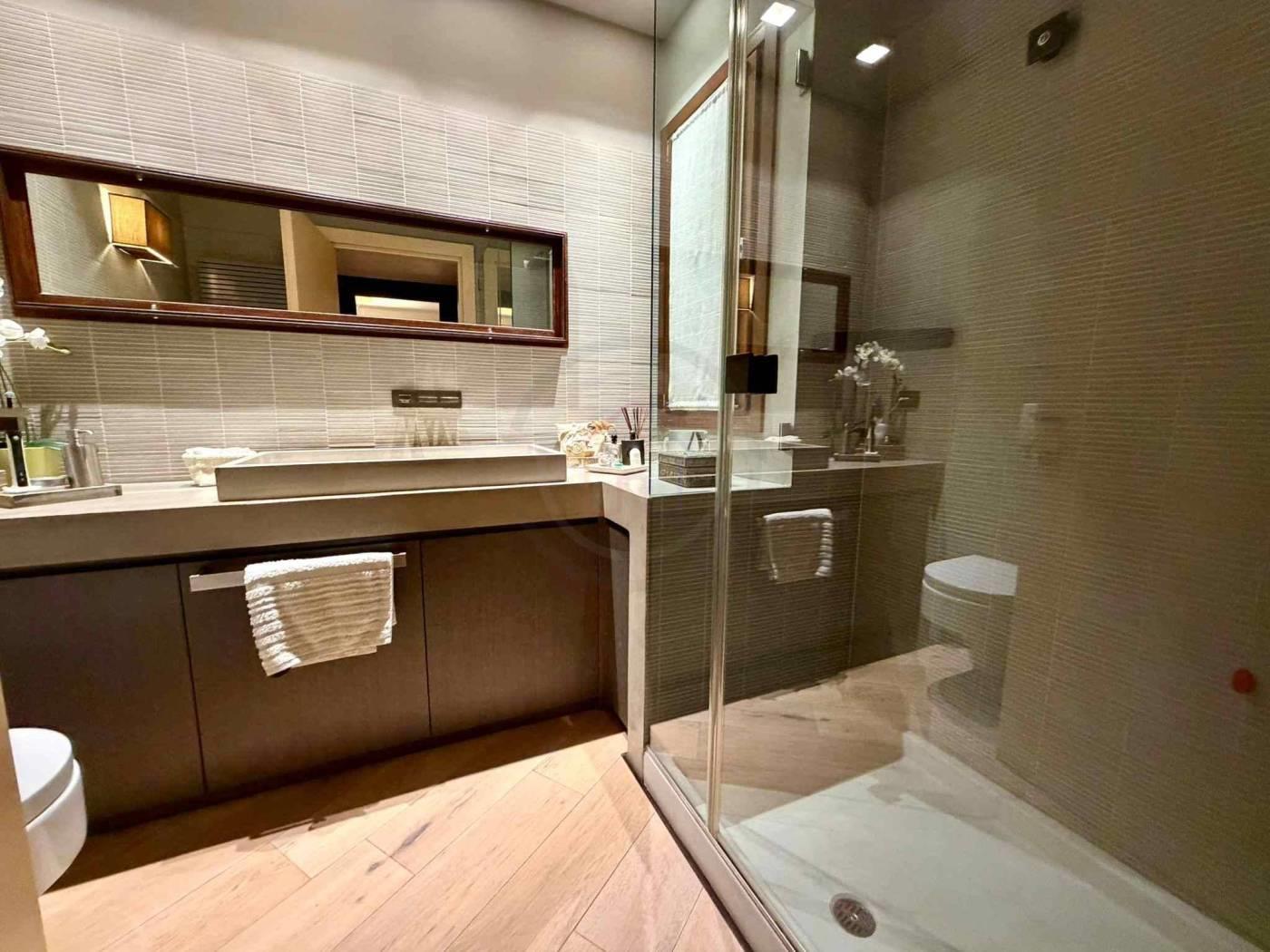 Il secondo bagno è rifinito con pareti in Pietra sanitari sospesi e un'ampia doccia;