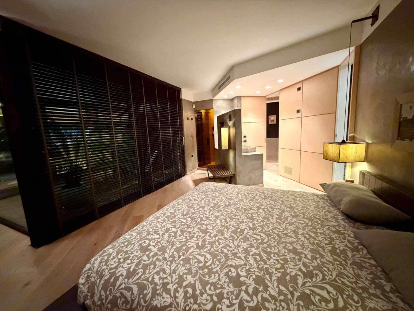 L'ampia camera matrimoniale è caratterizzata da mattoni a vista e una grande vetrata che si affaccia su un ampio patio privato e riservato, letto king-size, bagno en suite con ampia doccia e cabina armadio.