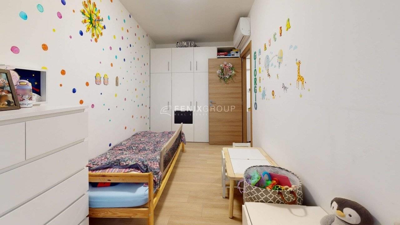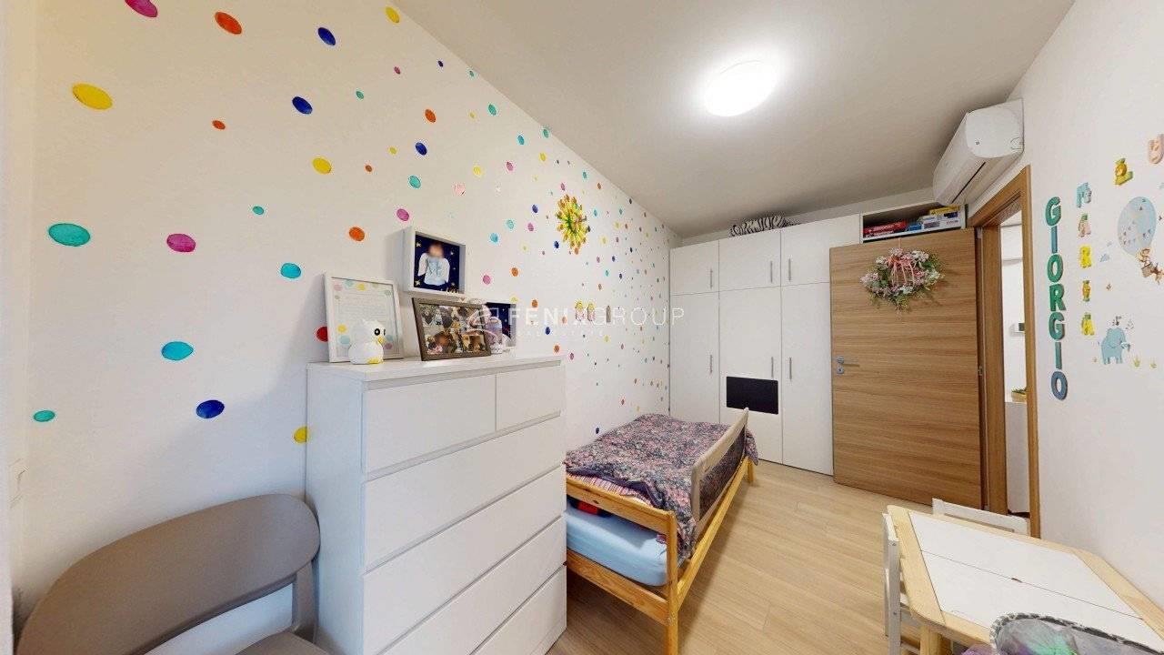 La camera matrimoniale dispone inoltre di un bagno privato finestrato, mentre un secondo bagno serve la zona giorno e la cameretta.