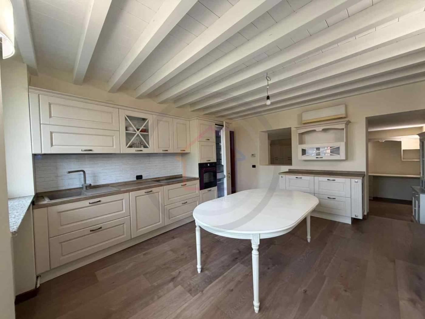 Finiture in parquet, travi a vista sbiancate.