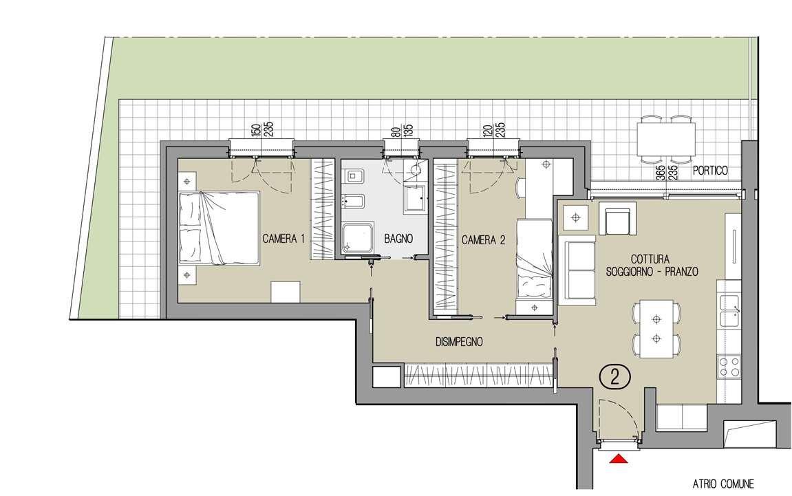 PROPOSTA TRILOCALE PIANO TERRA CON GIARDINO 02: soggiorno, cucina a vista , disimpegno, camera matrimonaile, seconda camera, bagno, Portico e giardino privato. Prezzo comprensivo di autorimessa: €. 268.000,00. possibilità acquisto posto auto €. 7.000,00