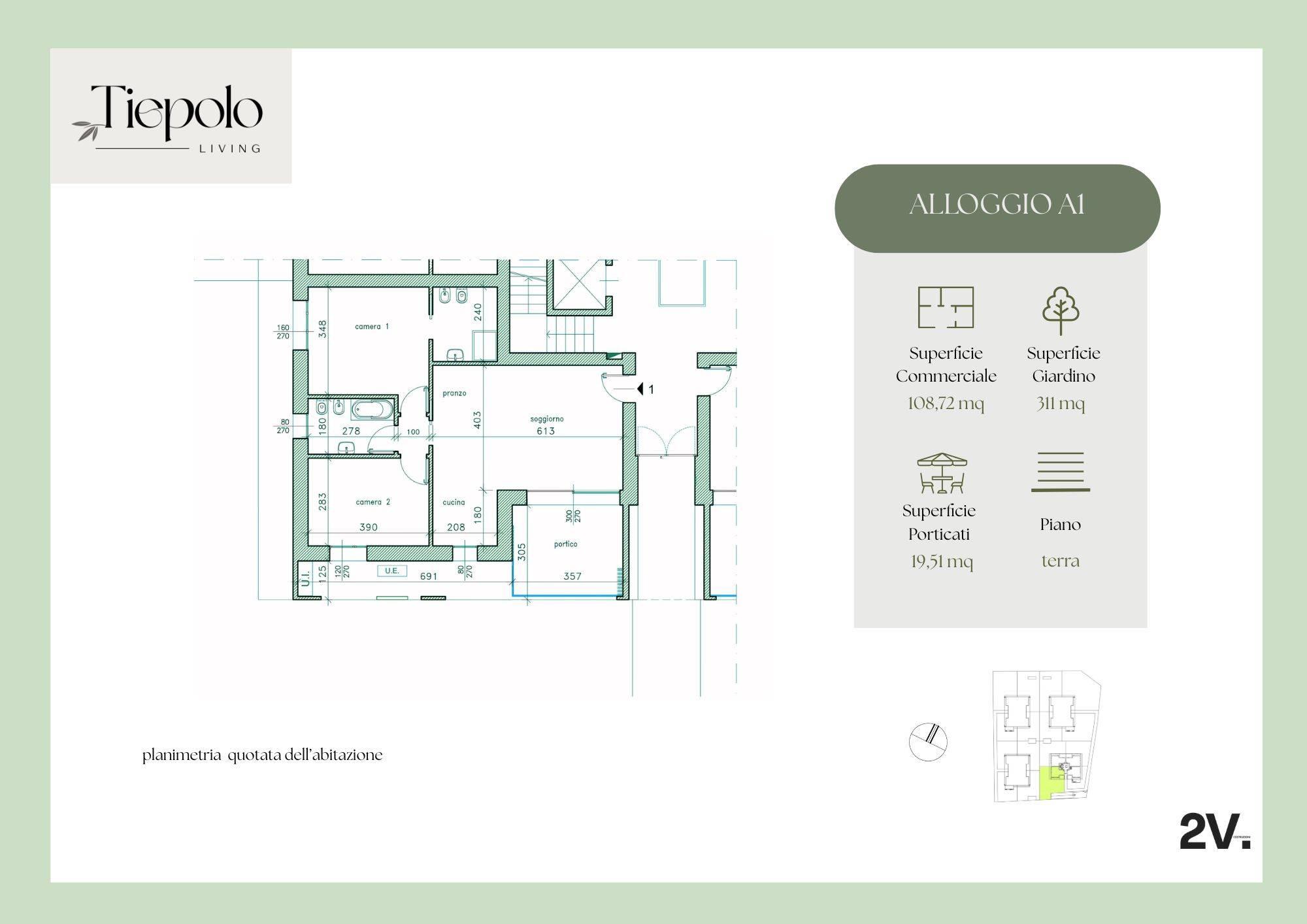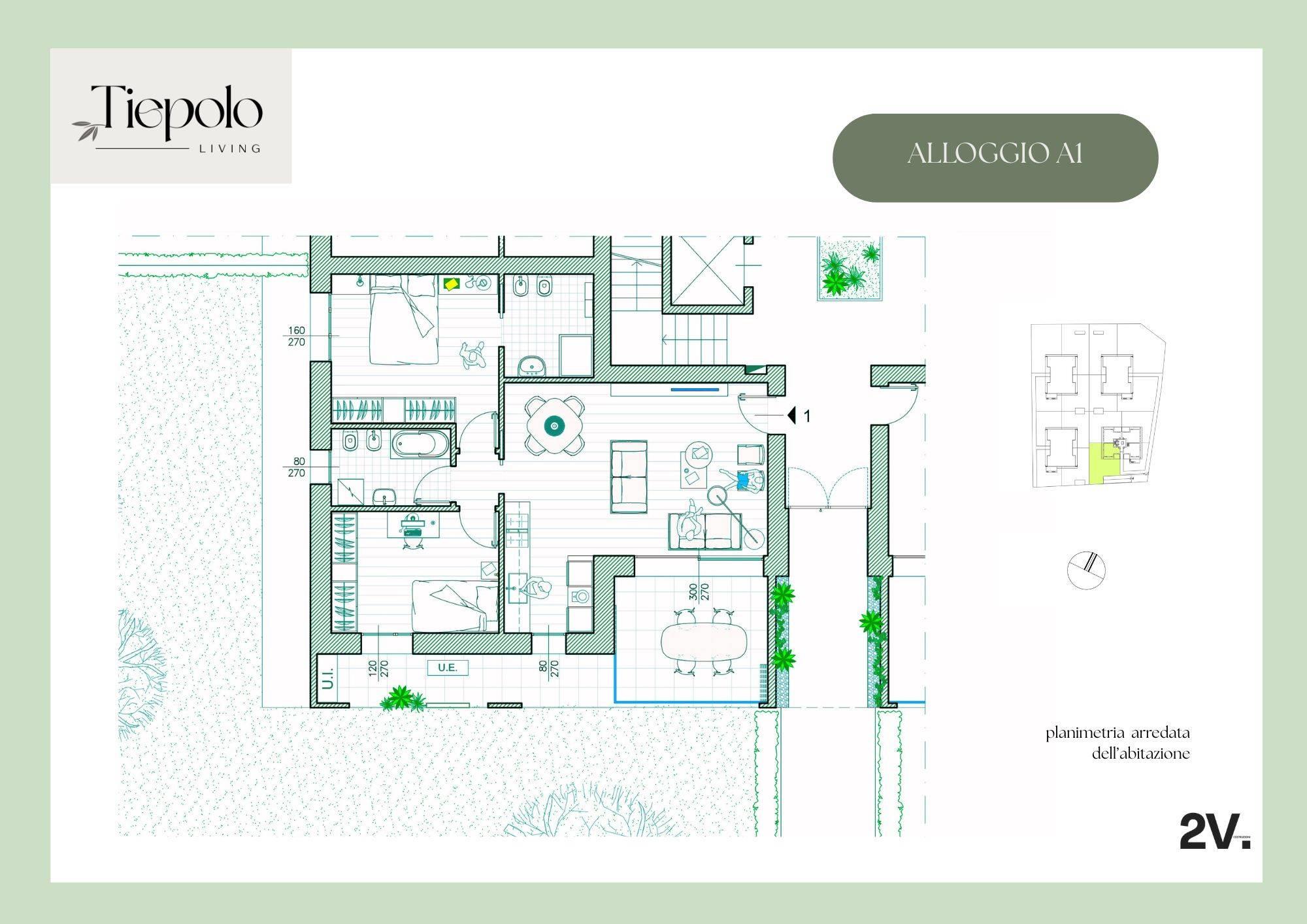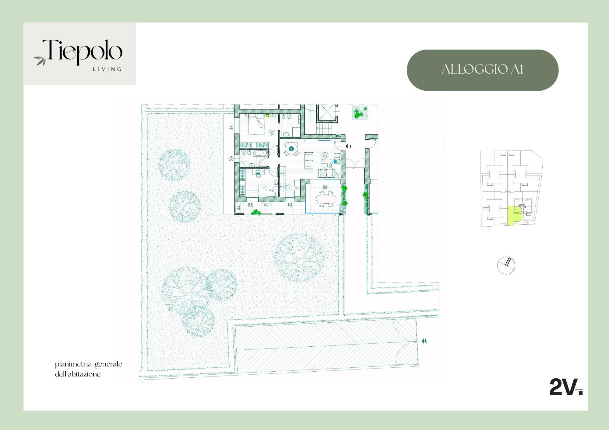 Tiepolo Living, appartamento A/1: tre locali con doppi servizi e giardino privato.