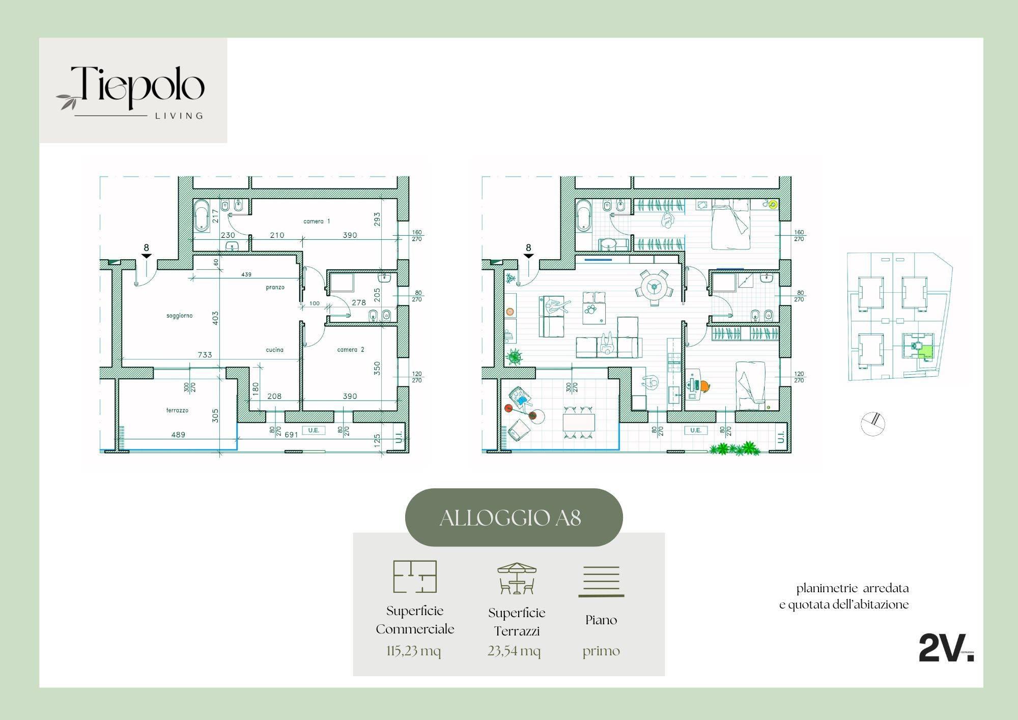 Tiepolo Living, appartamento A/8: tre locali con doppi servizi e terrazzo.