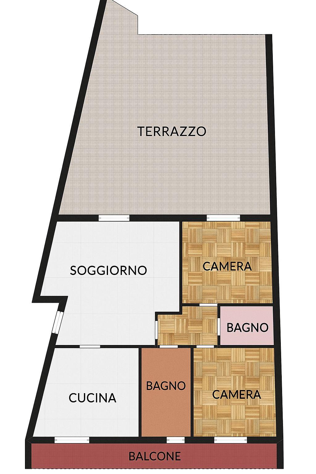 Dal terrazzo si accede anche alla cameretta, garantendo continuità tra gli spazi interni ed esterni. La cucina abitabile e la seconda camera dispongono invece di un ulteriore balcone comodo e funzionale.