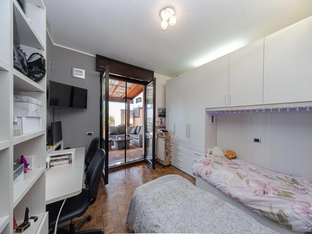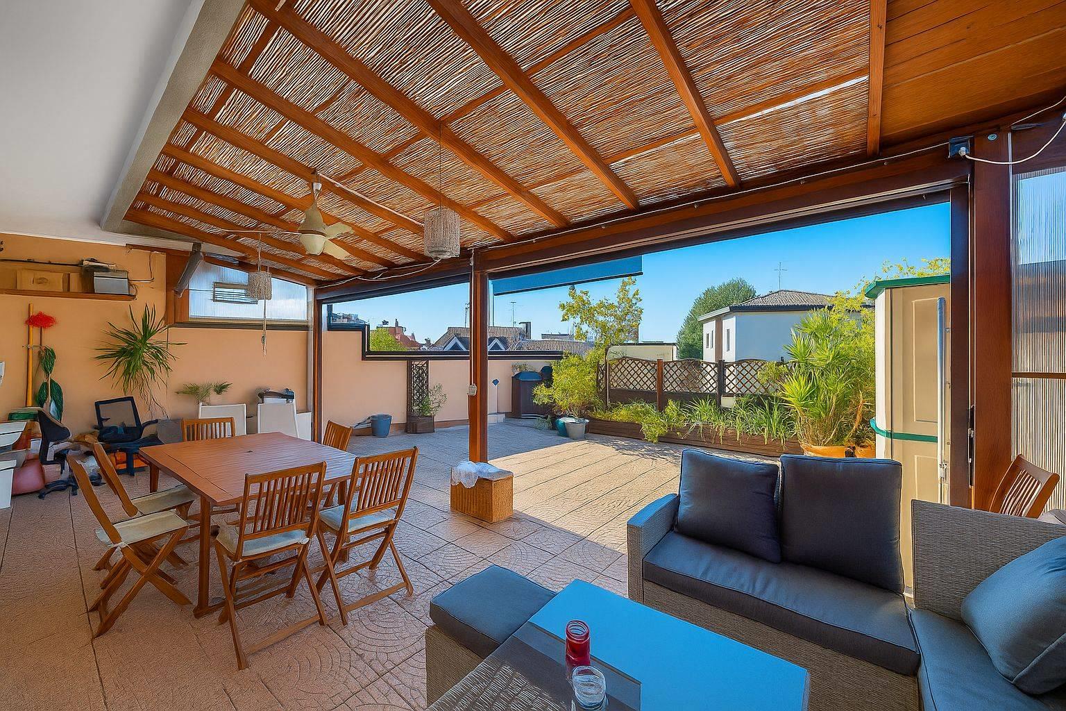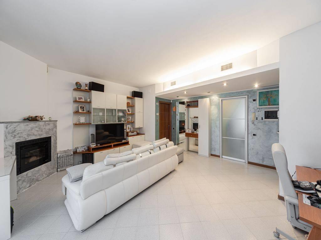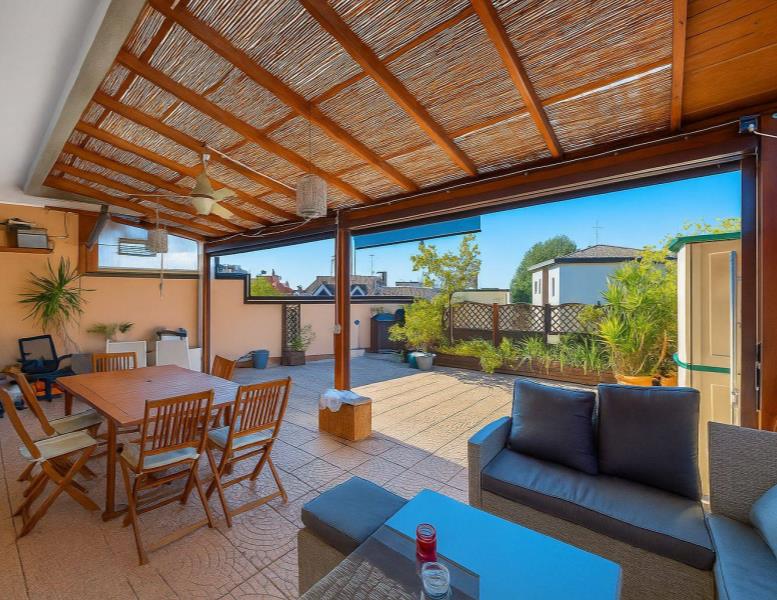 L’immobile, privo di ascensore, si compone di un luminoso soggiorno con camino a pellet canalizzato e accesso diretto a uno splendido terrazzo di circa 75 mq, parzialmente verandato, ideale per godere di momenti di relax in ogni stagione.