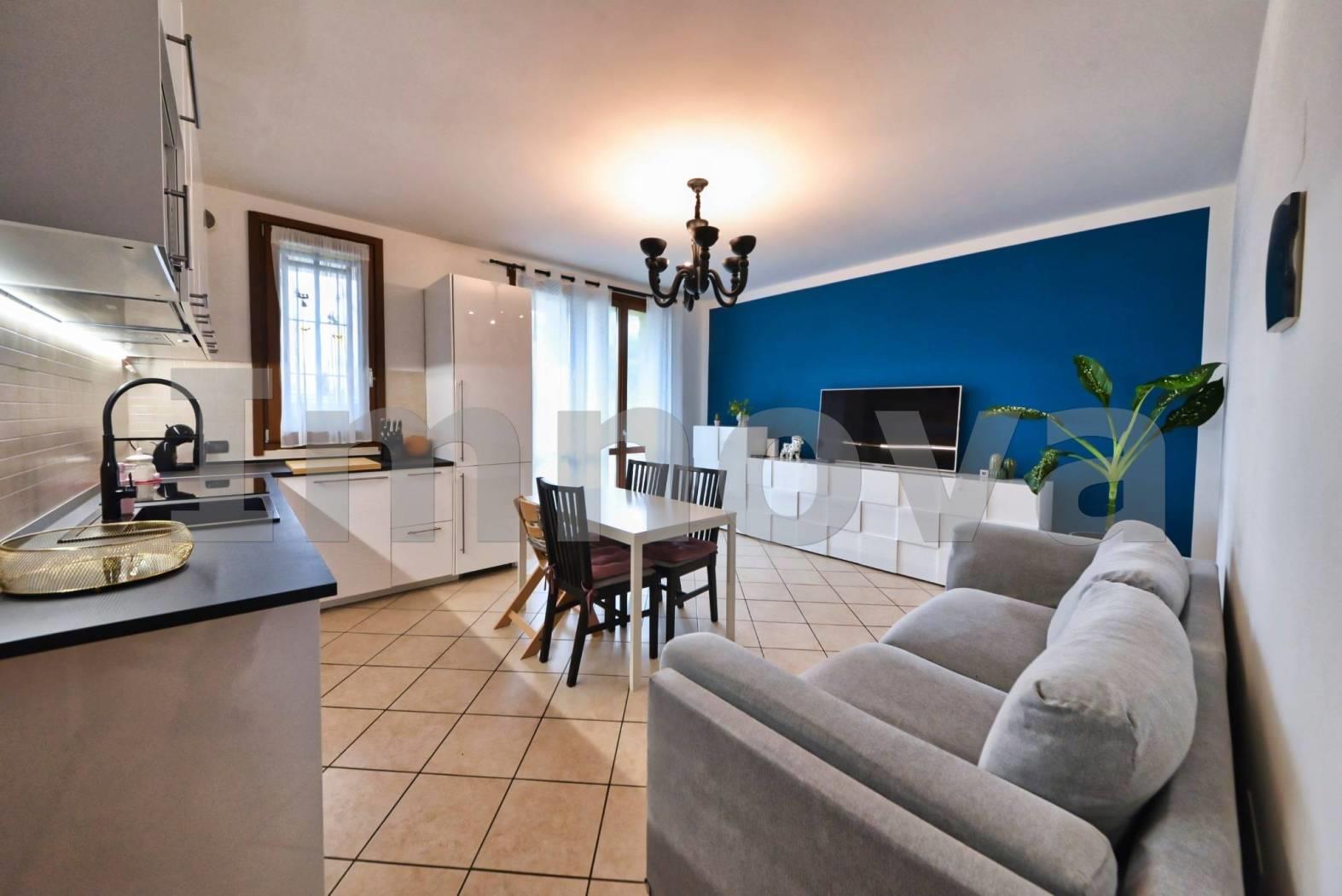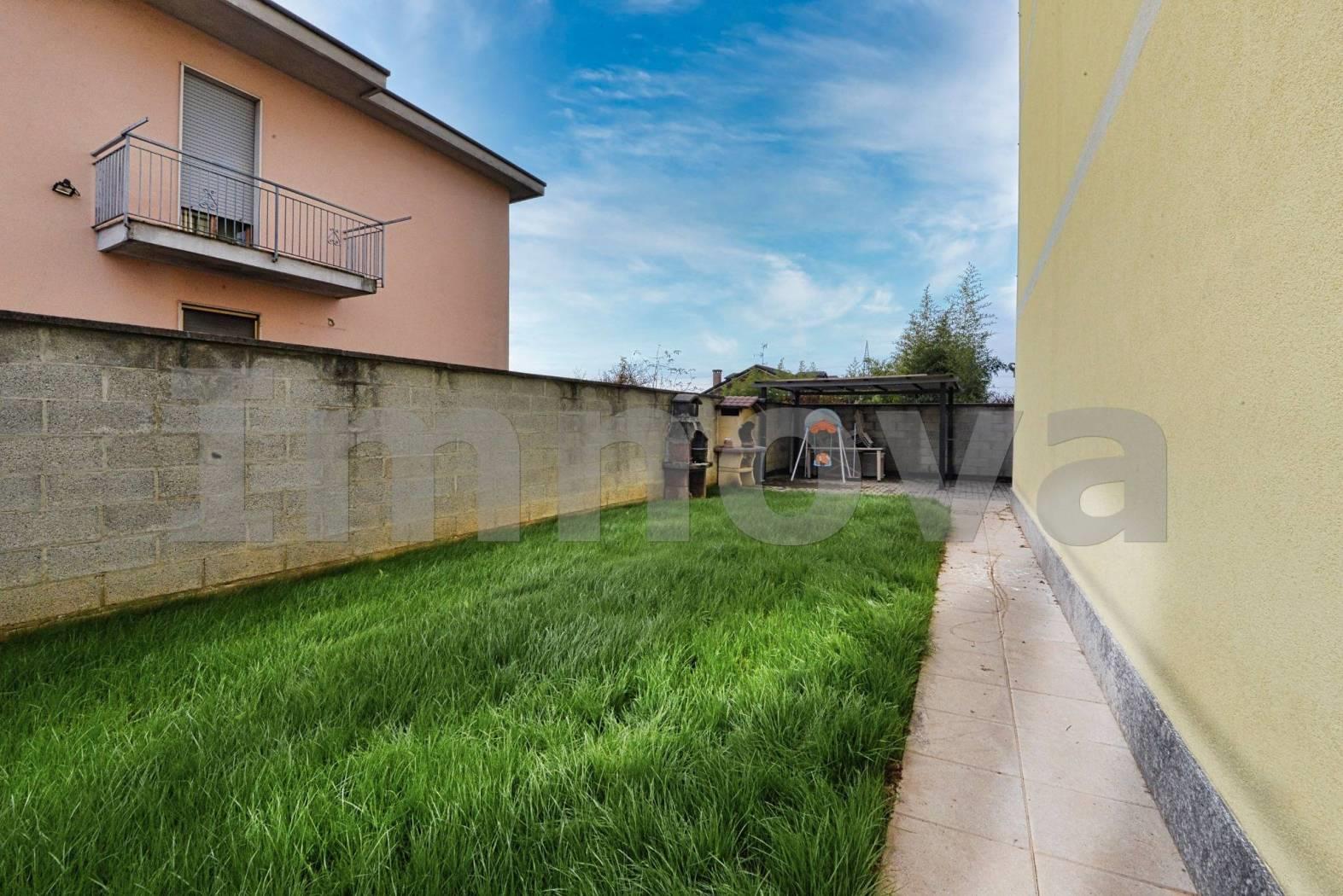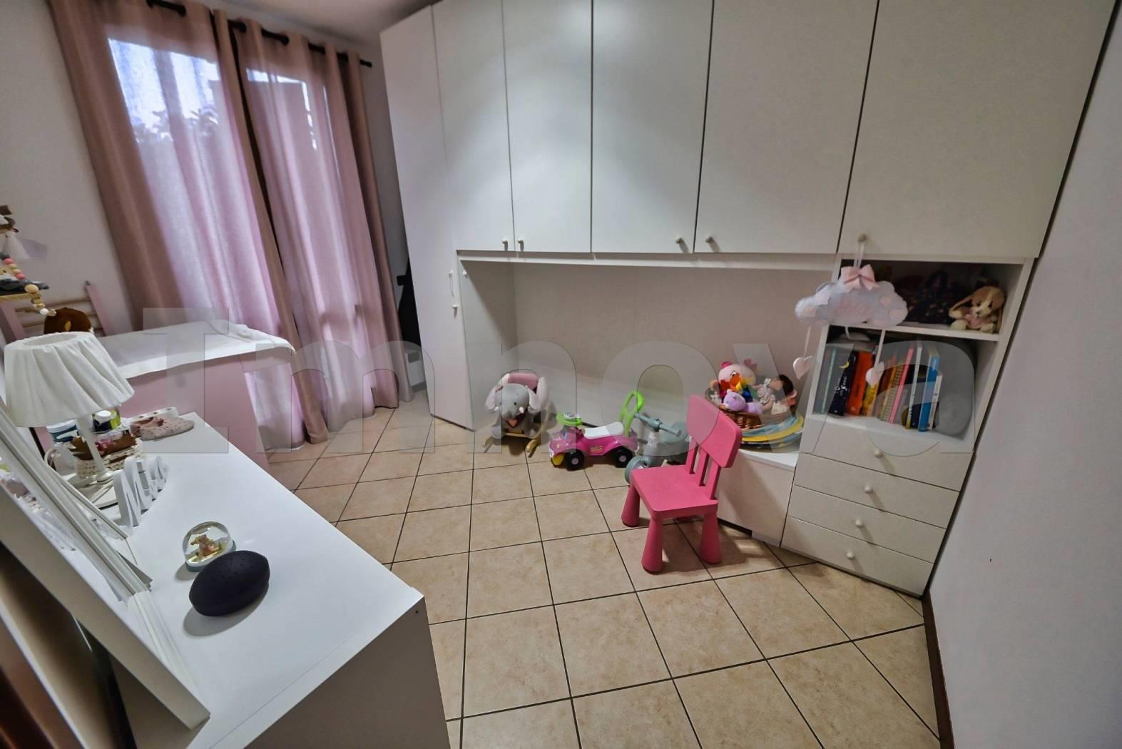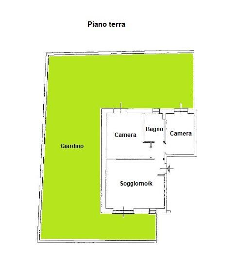 L'ingresso all' appartamento è direttamente sul soggiorno di pianta quadrata e attrezzato con angolo cottura, il disimpegno notte conduce alla camera matrimoniale, alla cameretta e al bagno con doccia. Tutti i locali hanno accesso diretto al giardino, che si sviluppa sui tre lati dell' abitazione per una metratura complessiva di circa 200 mq, ideale per trascorrere momenti di relax e svago con la famiglia ed amici.