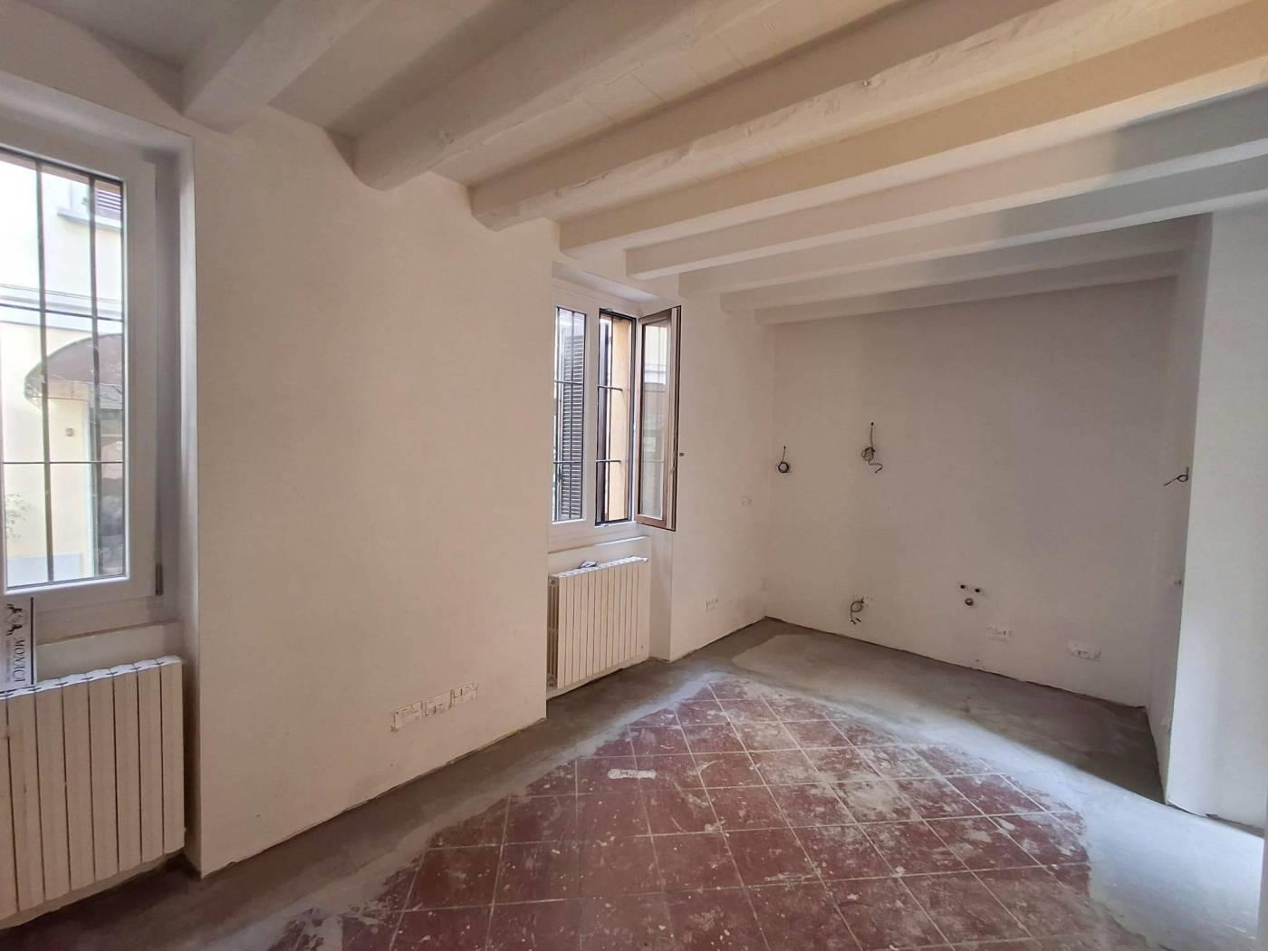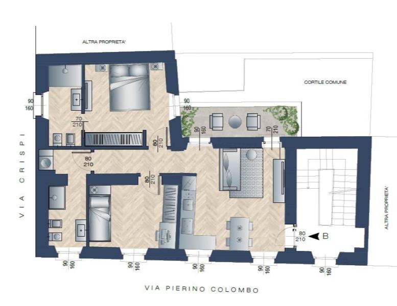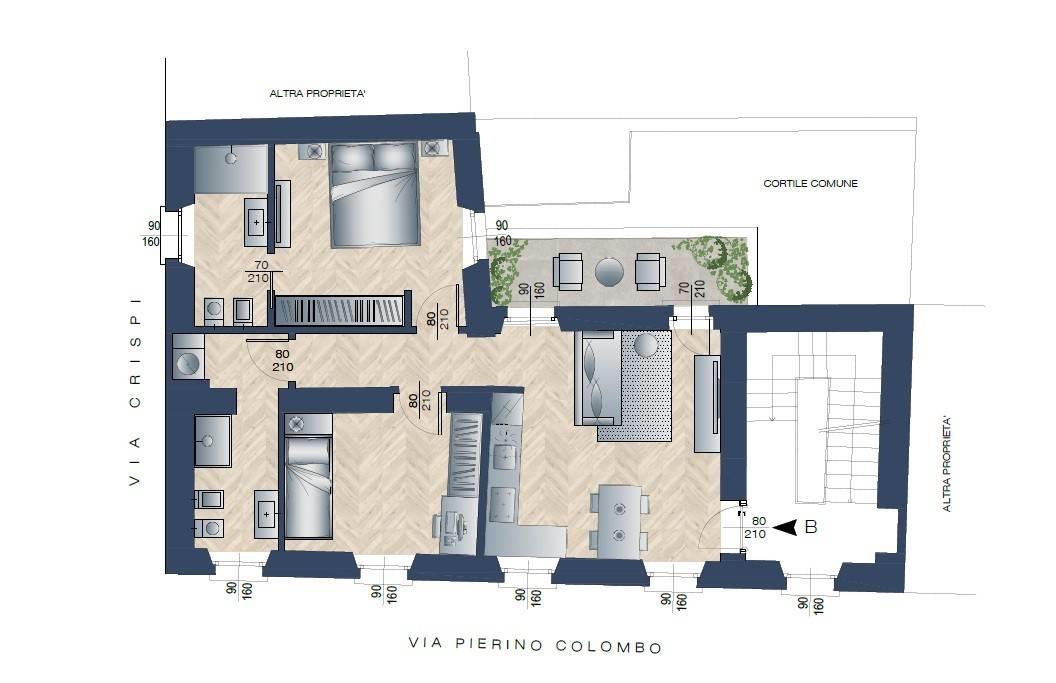 Appartamento al primo piano, in fase di totale ristrutturazione, con consegna aprile 2026, composto da tre locali con cucina a vista, due camere, doppi servizi, balcone.