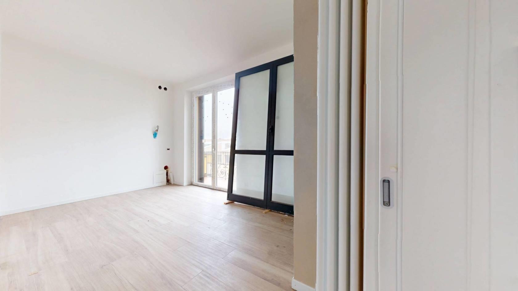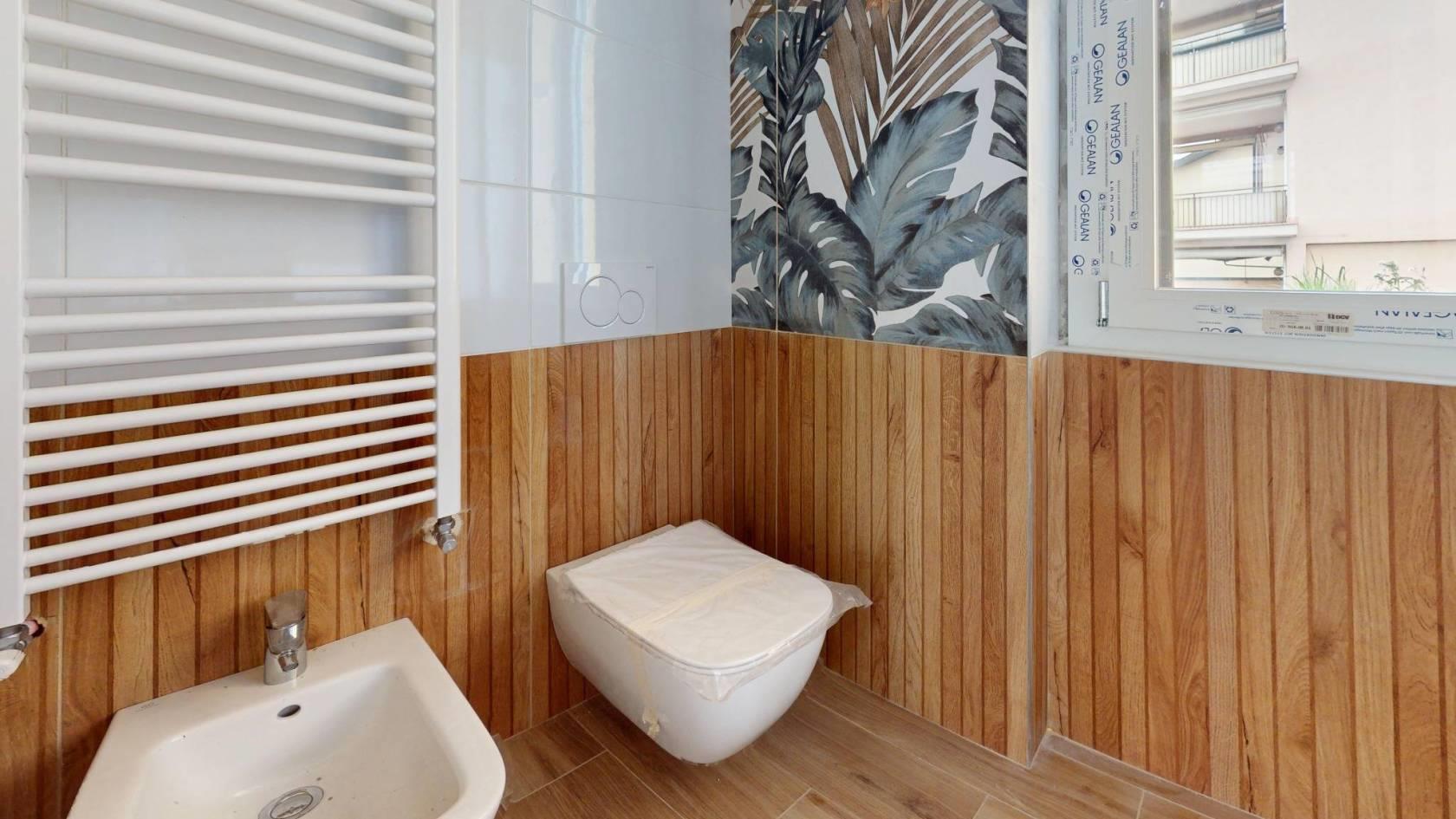 La zona notte offre due camere da letto funzionali e un bagno finestrato con sanitari sospesi e finiture di qualità. Ogni ambiente è curato nei minimi particolari: pavimento in gres porcellanato effetto parquet, infissi in PVC bianco, persiane scorrevoli, porte interne in legno e porta blindata all’ingresso.