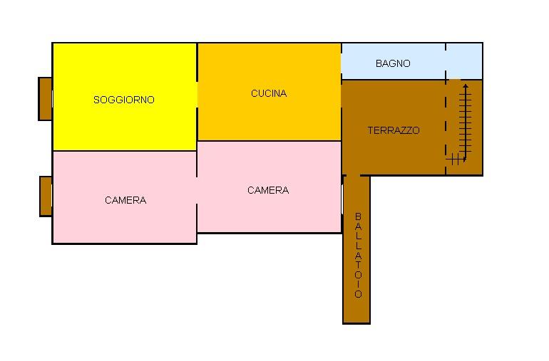 ingresso su cucina, soggiorno, due camere matrimoniali e servizio finestrato.