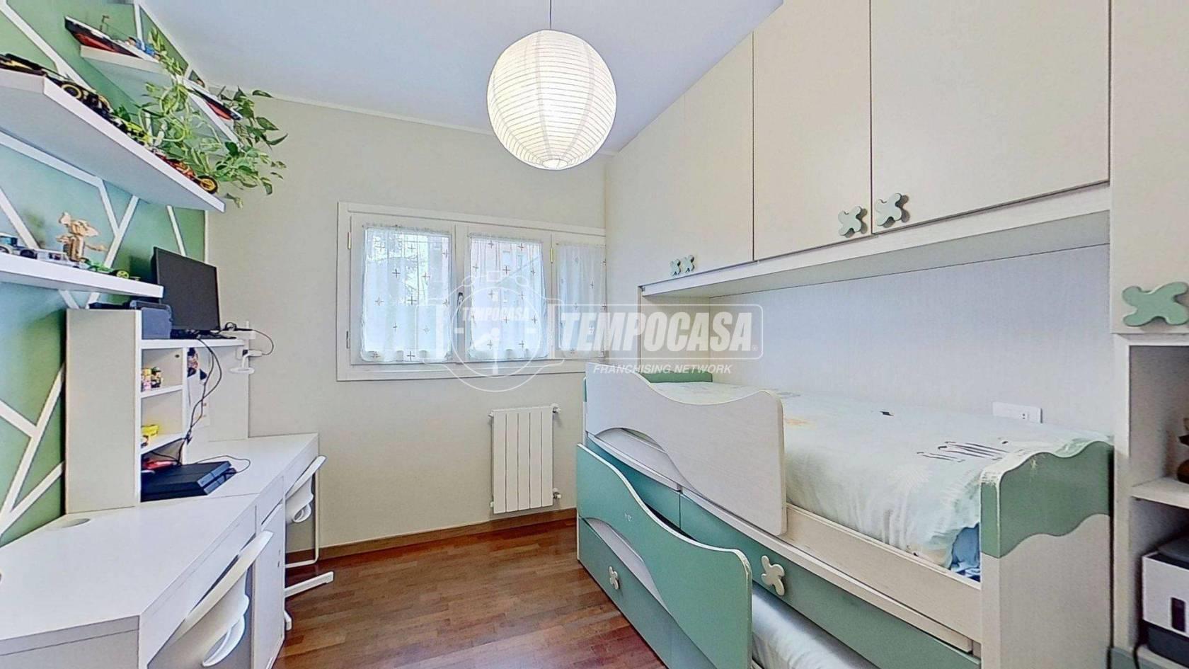 Rientrando all’interno, il corridoio conduce al bagno, moderno e curato nei dettagli, con un elegante box doccia e pavimenti in gres che conferiscono un tocco contemporaneo. Proseguendo nella zona notte, attraversiamo due camere da letto che regalano sensazioni di tranquillità. La prima stanza, ariosa e luminosa, è ideale per i bambini o per chi desidera uno spazio versatile, mentre la seconda colpisce per la presenza di un ampio armadio a muro, perfetto per ottimizzare l’organizzazione quotidiana.
