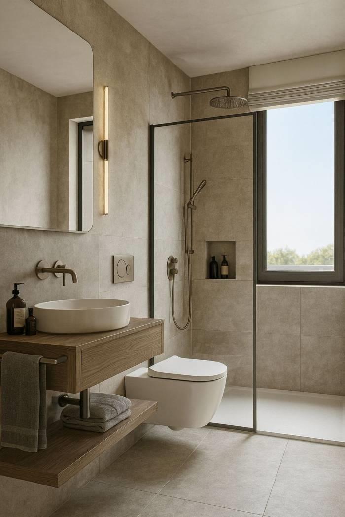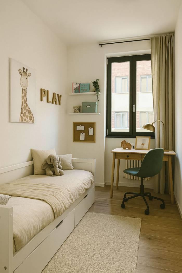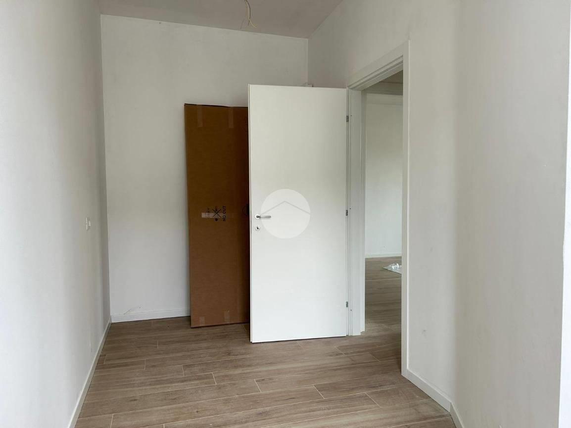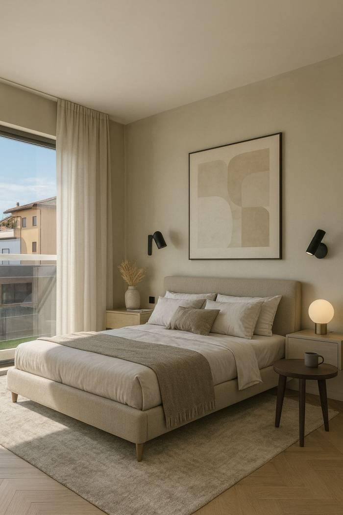 La zona notte è composta da due camere da letto ben distribuite e da un bagno elegante, rifinito con sanitari sospesi e dettagli di pregio. Ogni finitura è stata scelta con attenzione: pavimentazione in gres porcellanato effetto parquet, infissi in PVC bianco, persiane scorrevoli, porte in legno e una solida porta blindata all’ingresso.