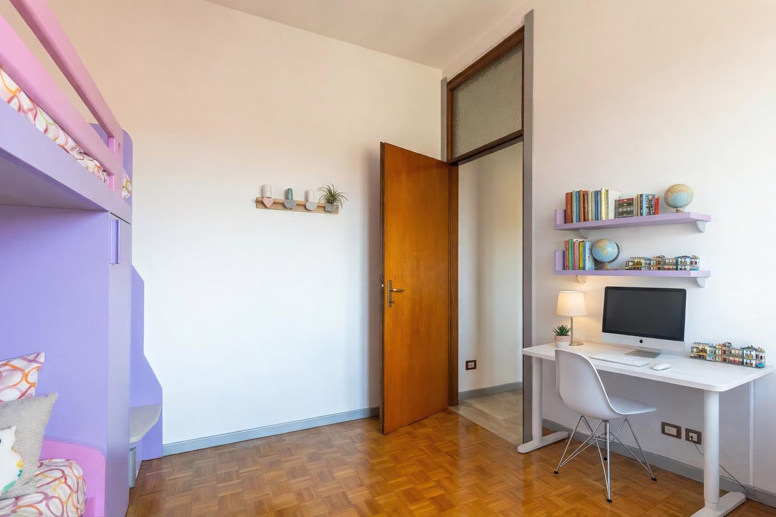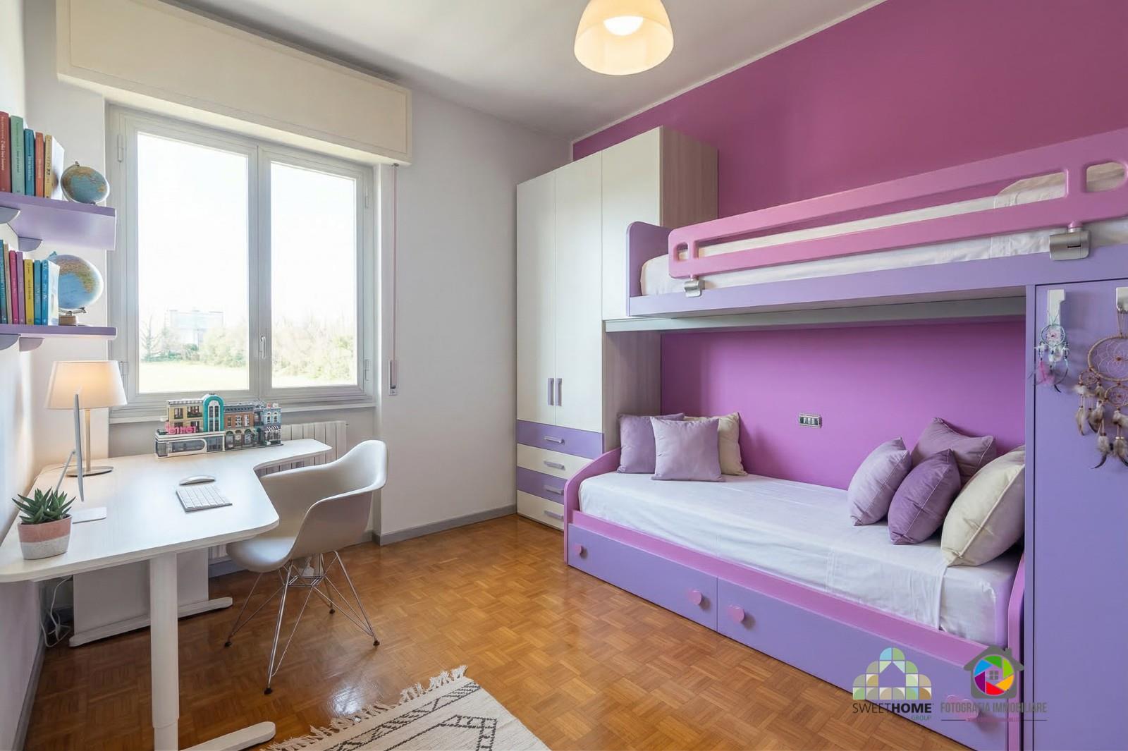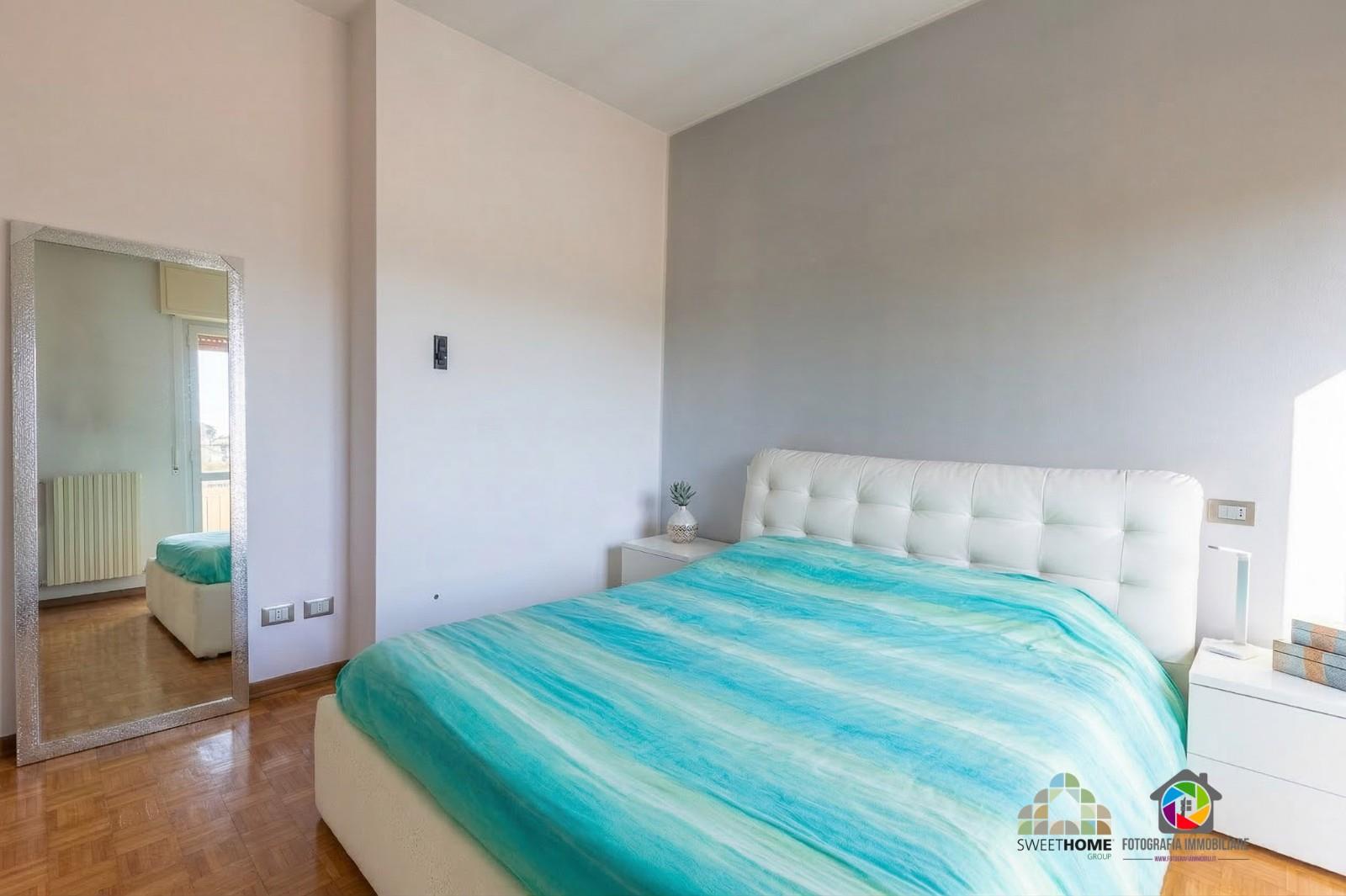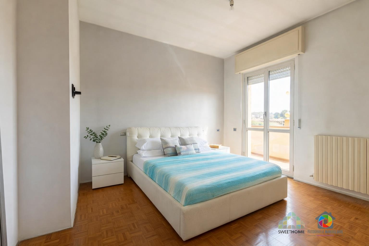 La zona notte, ben separata, offre una camera matrimoniale con balcone, una seconda camera spaziosa e un bagno finestrato con vasca.