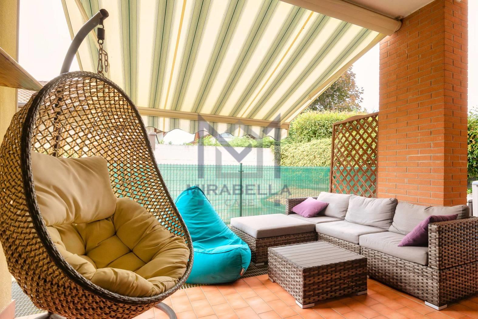 L'appartamento è posto al piano terra ed è così composto: l'ingresso si apre sulla confortevole e luminosa zona giorno (esposta est-ovest) completa di portafinestra che dà accesso allo splendido portico attrezzato con soggiorno esterno ed al giardino di proprietà che abbraccia l'immobile sui 3 lati.