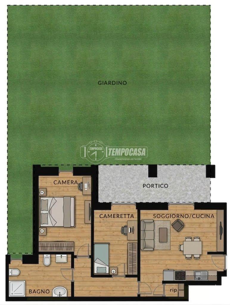L’appartamento si sviluppa su una superficie di circa 95 mq e accoglie con una zona giorno funzionale, dove soggiorno e angolo cottura creano un ambiente conviviale, perfetto per la quotidianità e per i momenti in compagnia. La presenza del portico, direttamente collegato al giardino privato ad uso esclusivo, amplia lo spazio verso l’esterno e permette di vivere la casa anche all’aperto, dalla colazione nelle belle giornate fino al relax serale.
